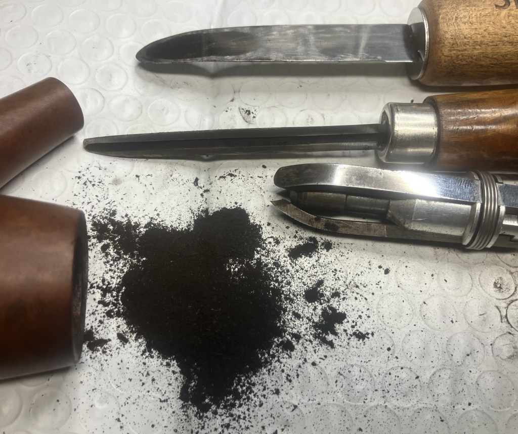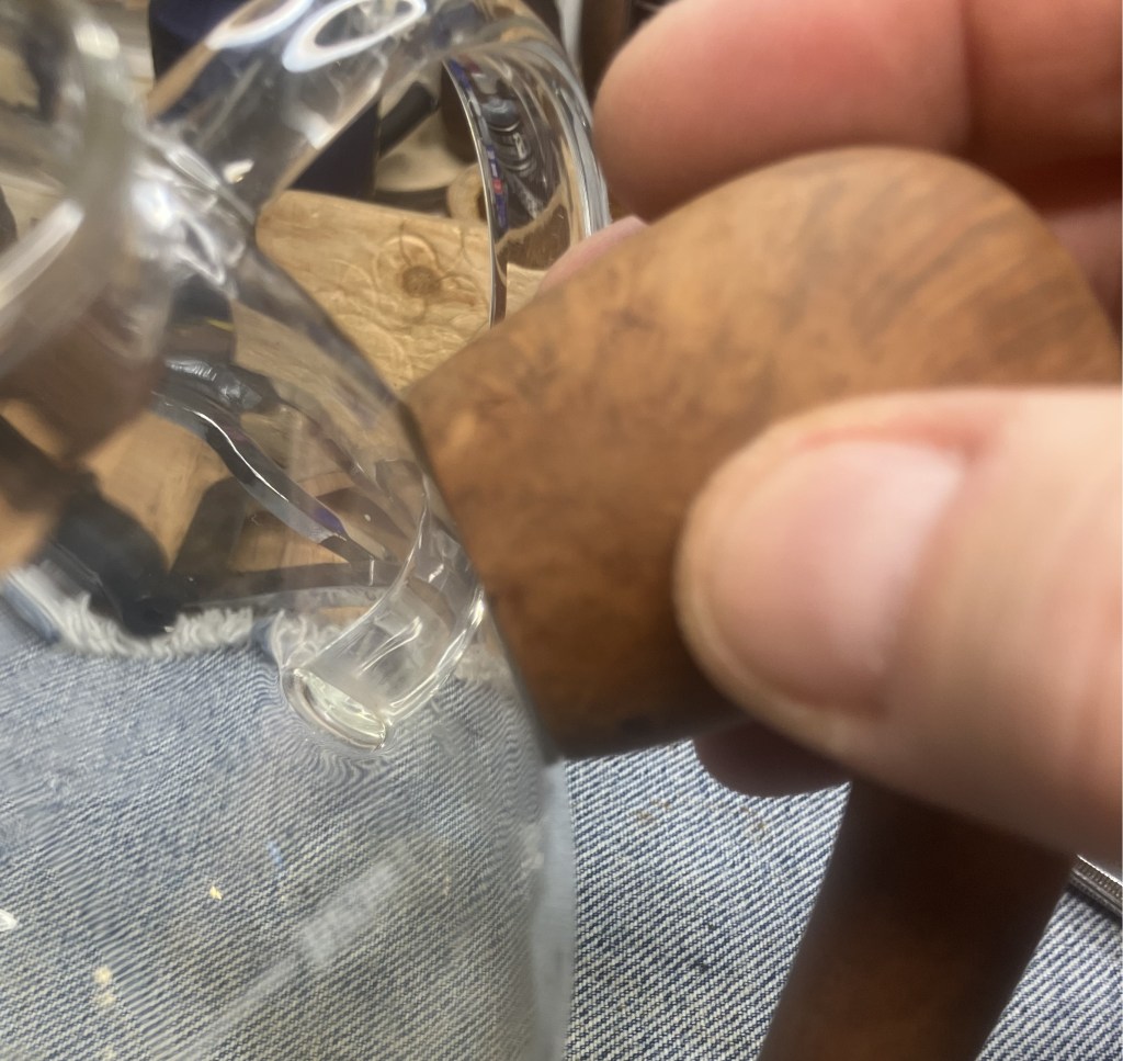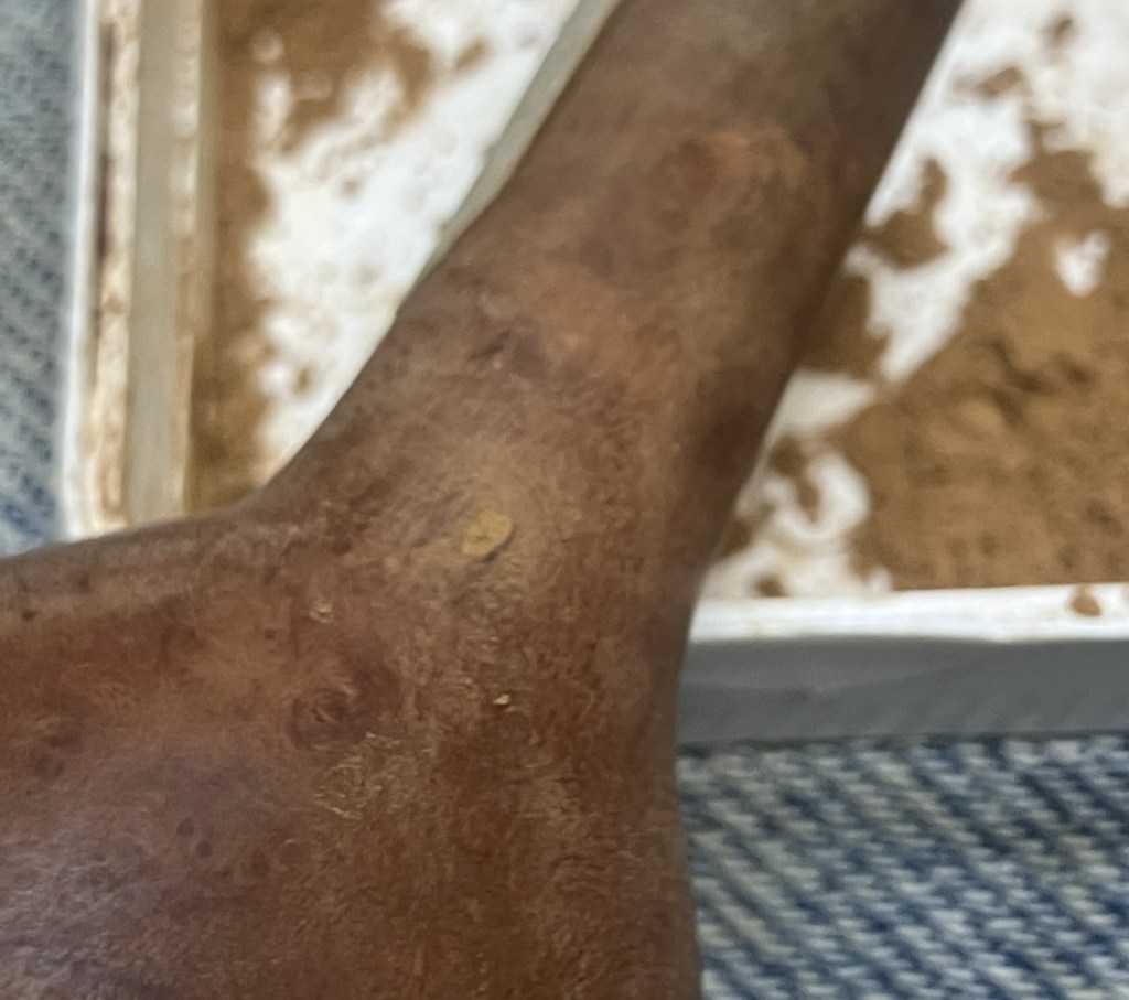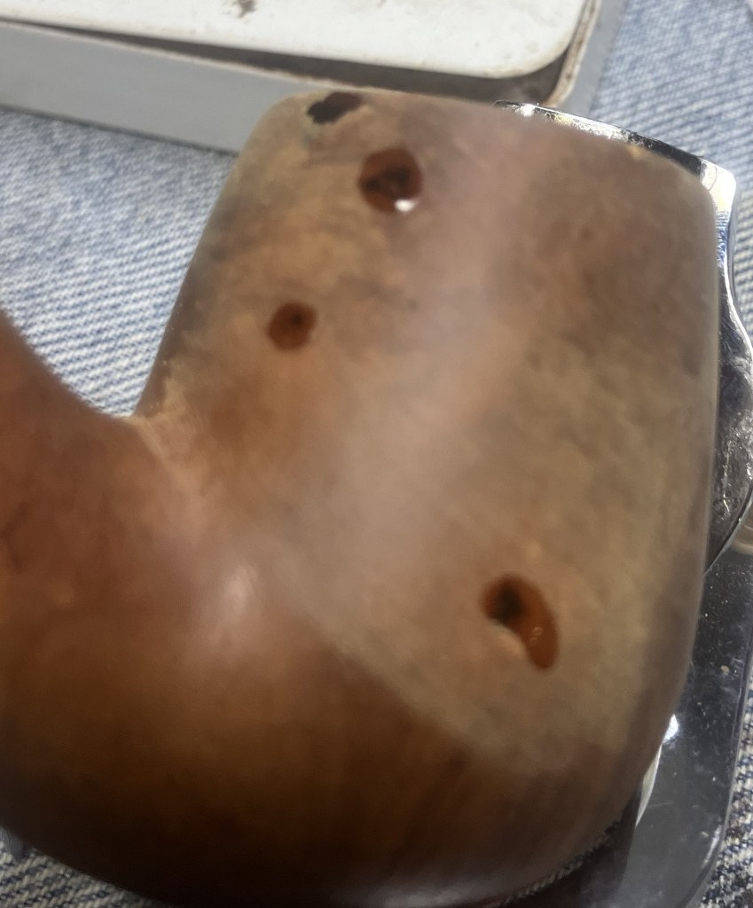 The larger pits were packed with briar dust by pressing the dust in with my finger tip or the curved back of the dental scraper..