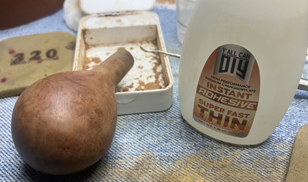 Using a fine disposable applicator tip on the bottle of CA, I applied a small drop of Thin CA to the briar dust.