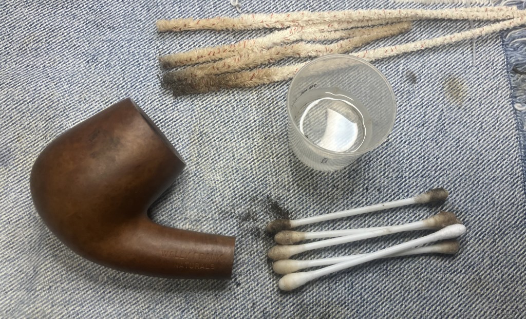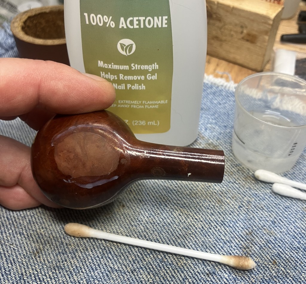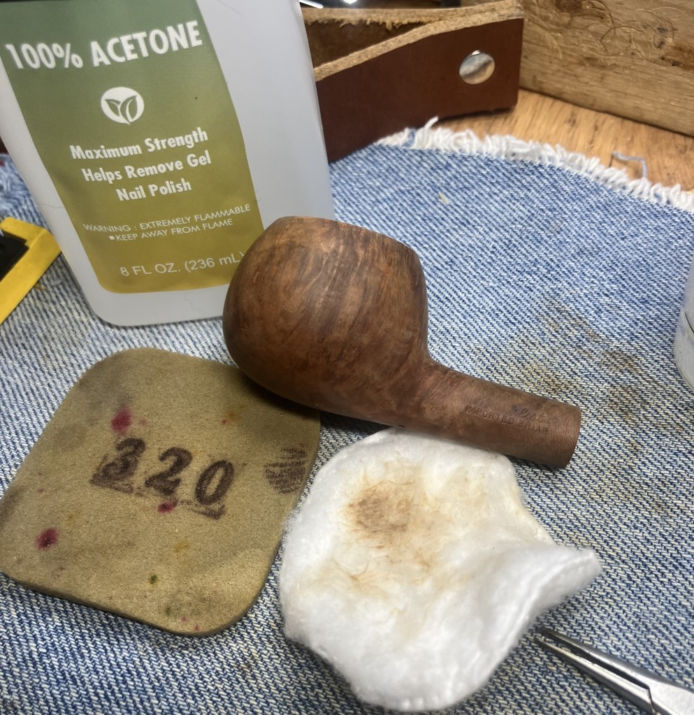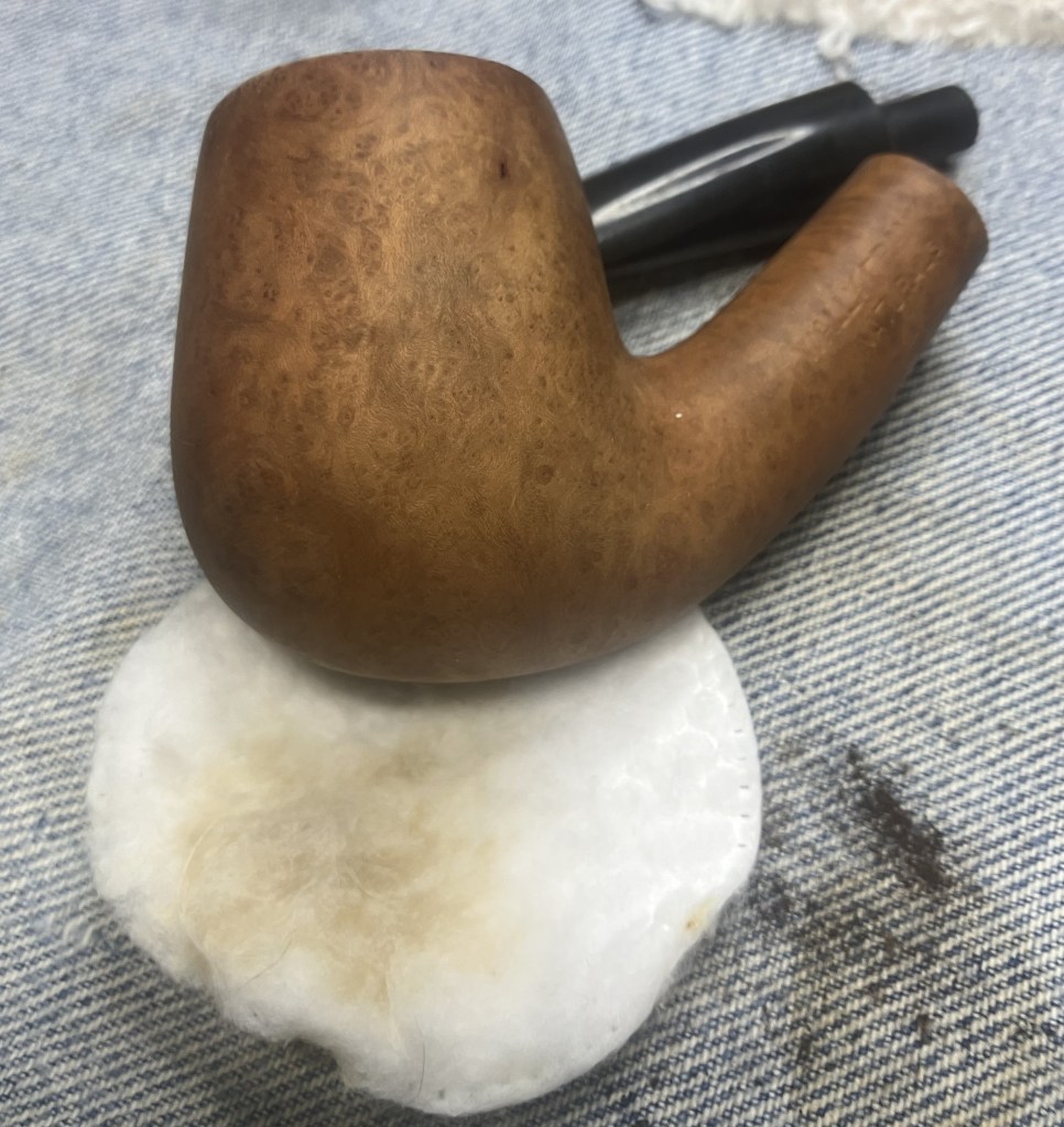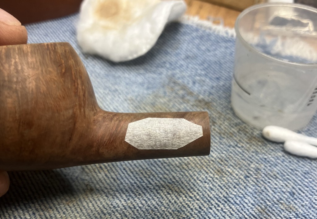 Back at the workbench the stummel was wiped with a make-up pad wetted with 99% ethyl alcohol. Very little color came off the briar indicating that it was clean of dirt and wax.