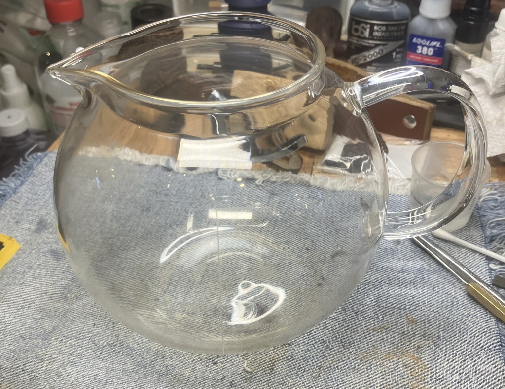 Now, I bet you are wondering, “why does this clown have a tea pot on his workbench?” Good question. This clown thought that I did not have any round surface large enough for sanding the bevel of this rim. Violla, a tea pot might just be a fitting curve.