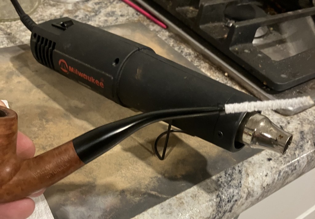 I placed a pipe cleaner in the stem then used a heat gun to heat the vulcanite and rebend it