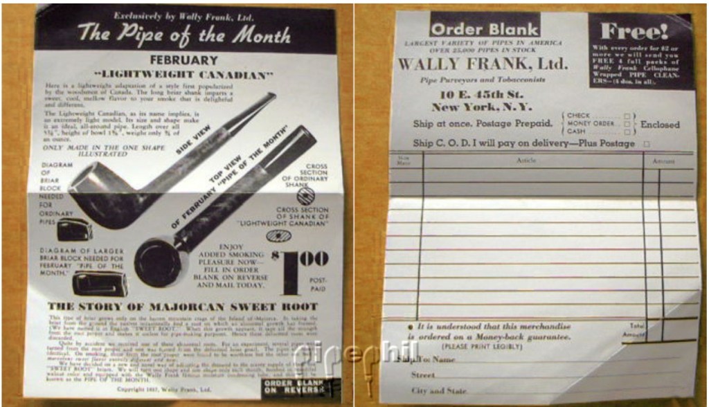 “Okay, back to my editorializing about Wally. The huge variety, nearly schizophrenic in nature, of Wally Frank style pipes may be due to his constantly trying to keep his offerings fresh in a competitive pipe market. Frank’s pipes were not what I would consider high end pipes. He was likely going after customers with less disposable income and mimicking a variety of popular styles . He was known to venture throughout Europe searching for less known carvers and small shops where he could purchase quality at lower prices. Wally Frank’s unique pipe offerings may make more sense when you consider the Wally Frank “Pipe of the Month Club”, an early subscription pipe offer. He apparently wanted to keep the customers satisfied with new and unique offerings. Here is the order form from http://www.pipephil.eu/logos/en/logo-w1.html