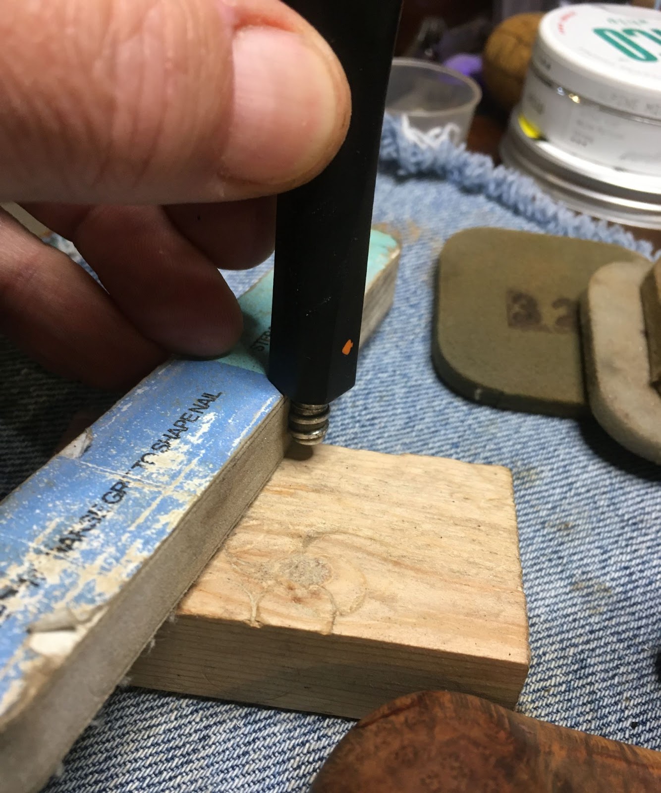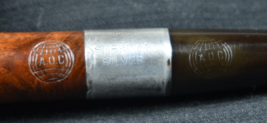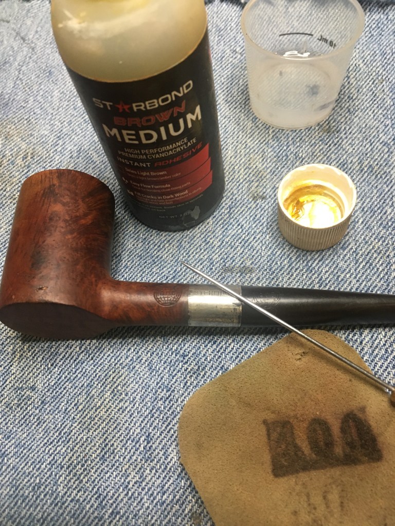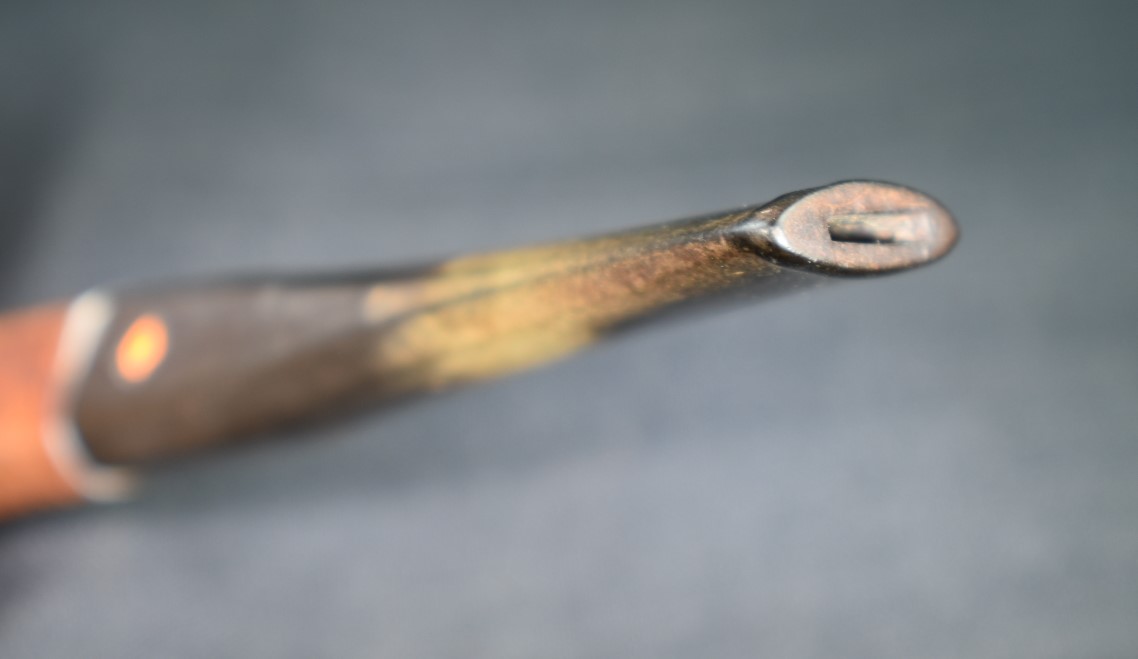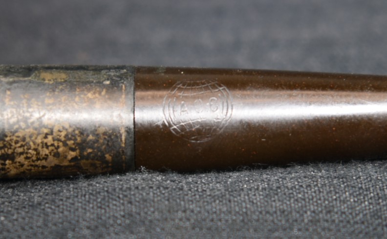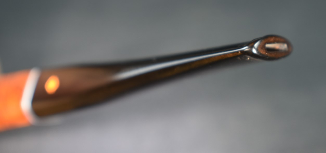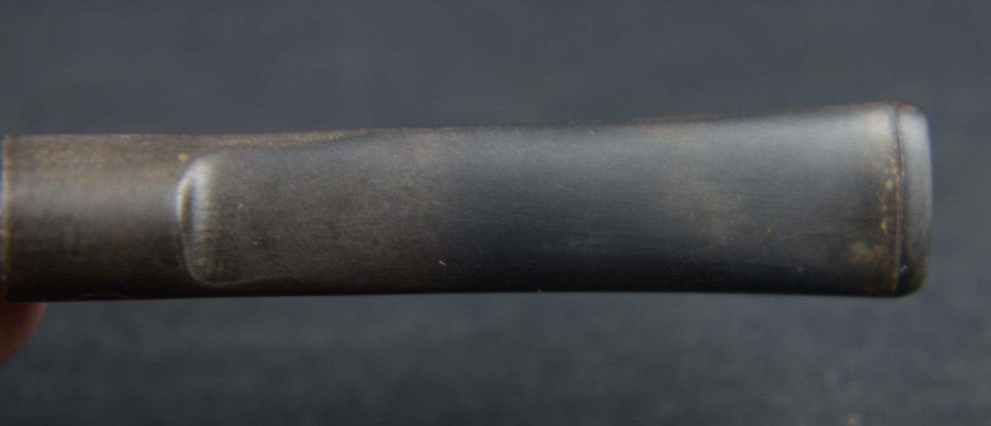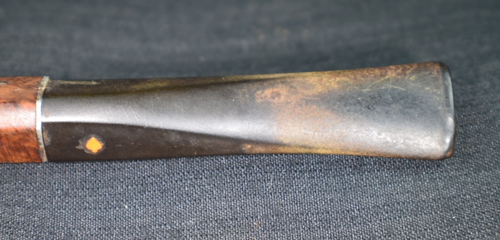 A fly tying bodkin was used to apply thin cyanoacrylate (CA, super glue) along the length of the crack. The thin CA penetrated into the crack. Brown CA was applied to the shank and the band was tapped into position. The excess CA was wiped off with a cotton ball wetted in acetone. The fly tying bodkin was again used to apply a bead of brown CA around the outside edge of the band filling the slight gap between the shank and the brass band. Once cured this was sanded smooth. Below is a closeup of the DENICOTEA stamp and the band.