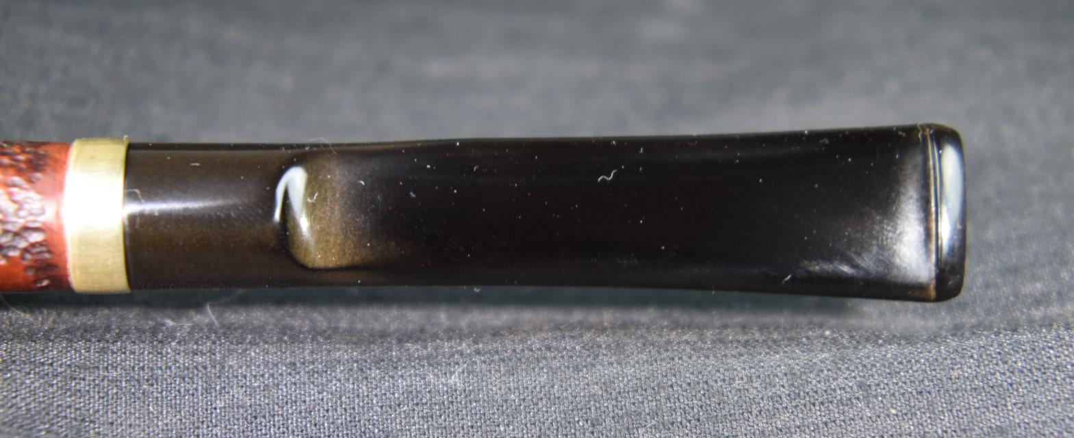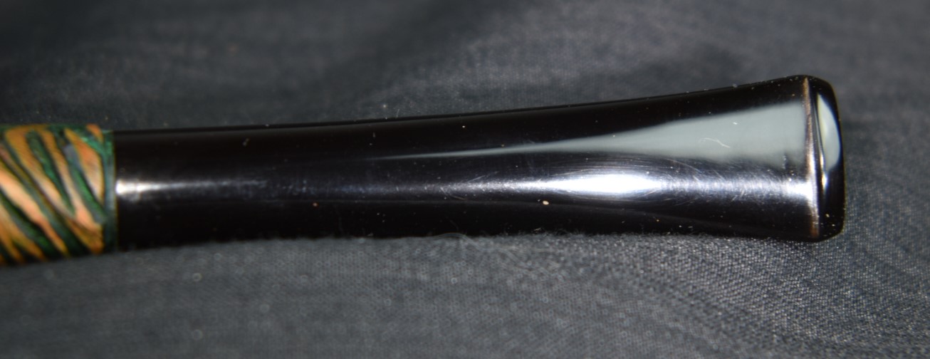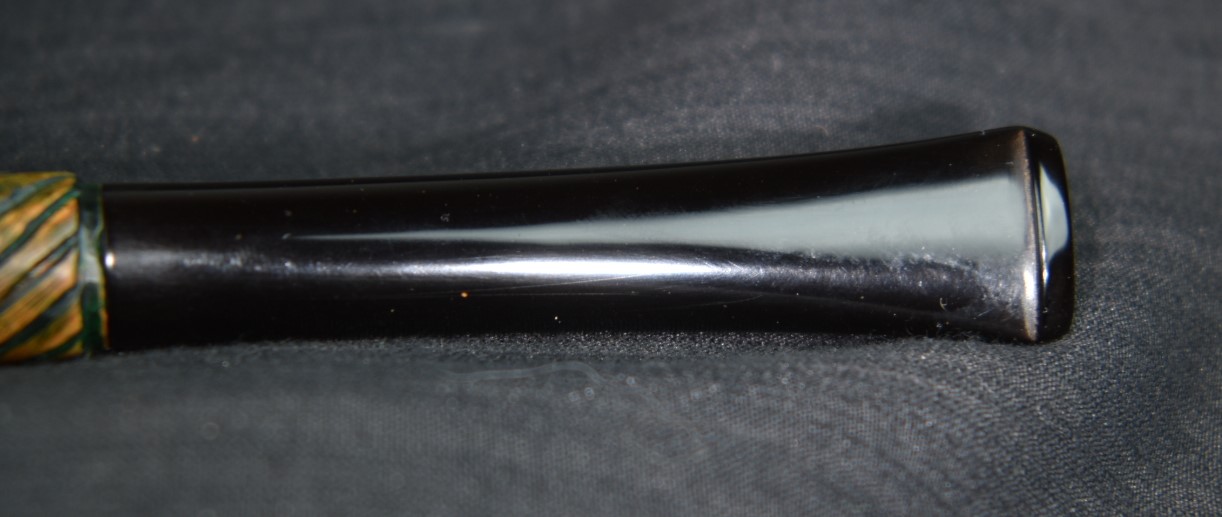 Below is the band close to it’s new home. At this point the stem was taken to the buffer where I used a rouge buffing compound to polish the stem. I had not done this before. Normally I will sand with the sanding sponges then use the micro-mesh pads. This stem did not appear to need any sanding to smooth easy scratches or blemishes, except for immediately below the button. The tooth chatter was sanded using the sanding sponges but it was difficult to work between the saddle and the button.