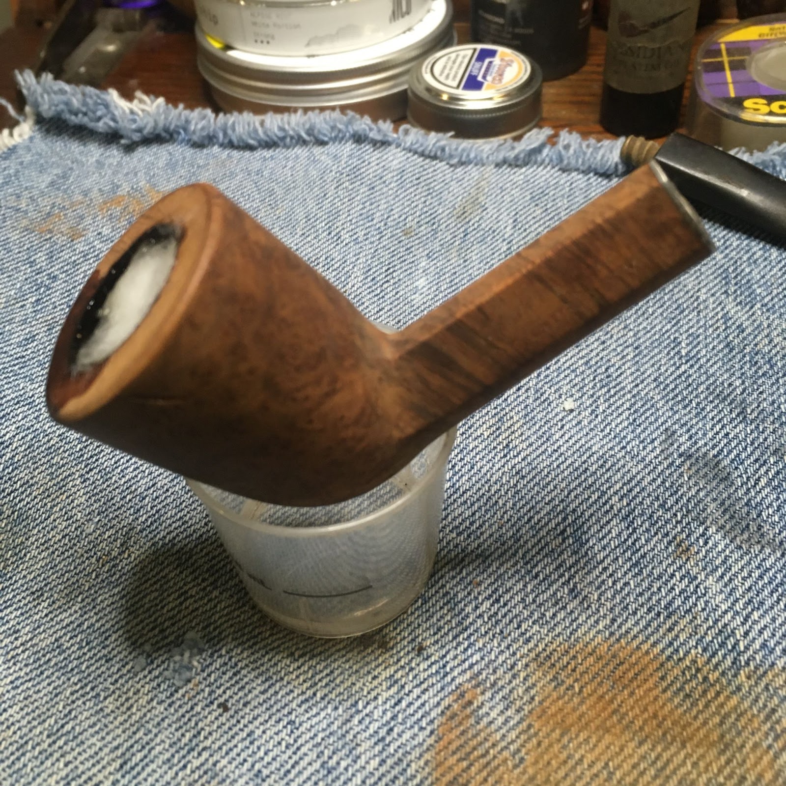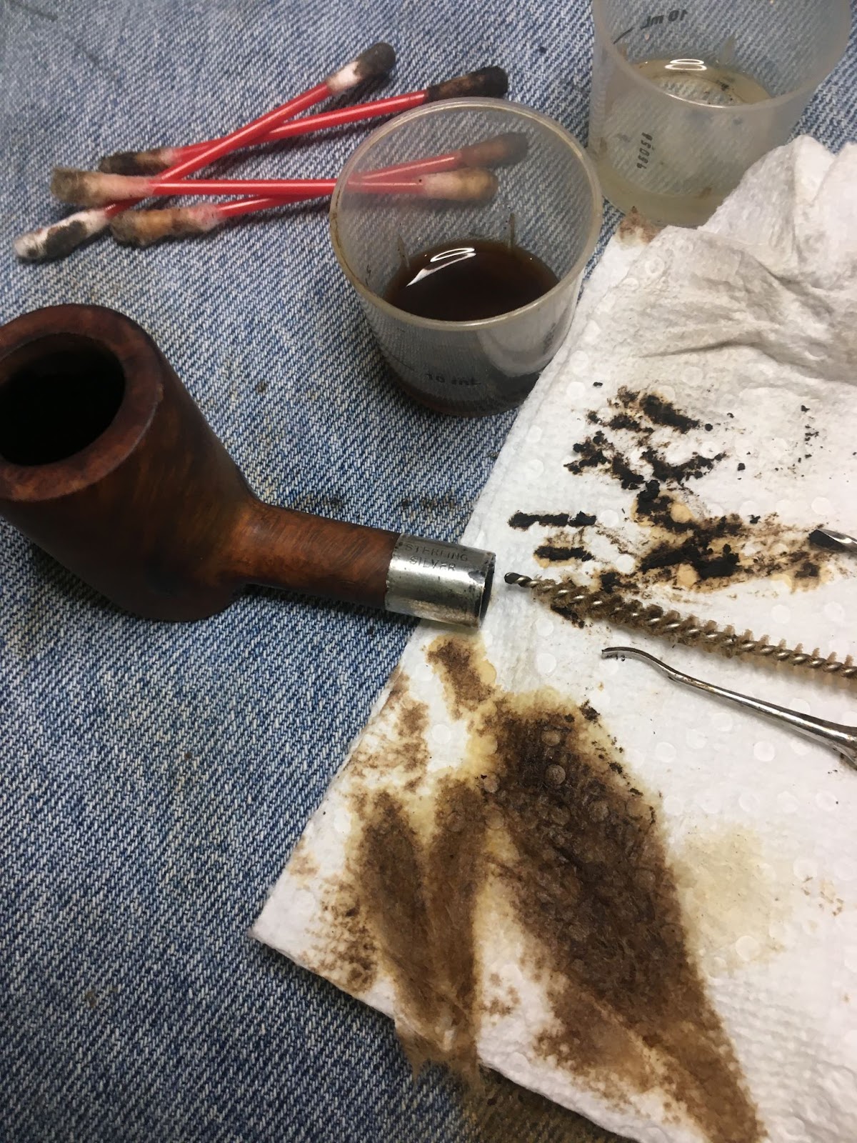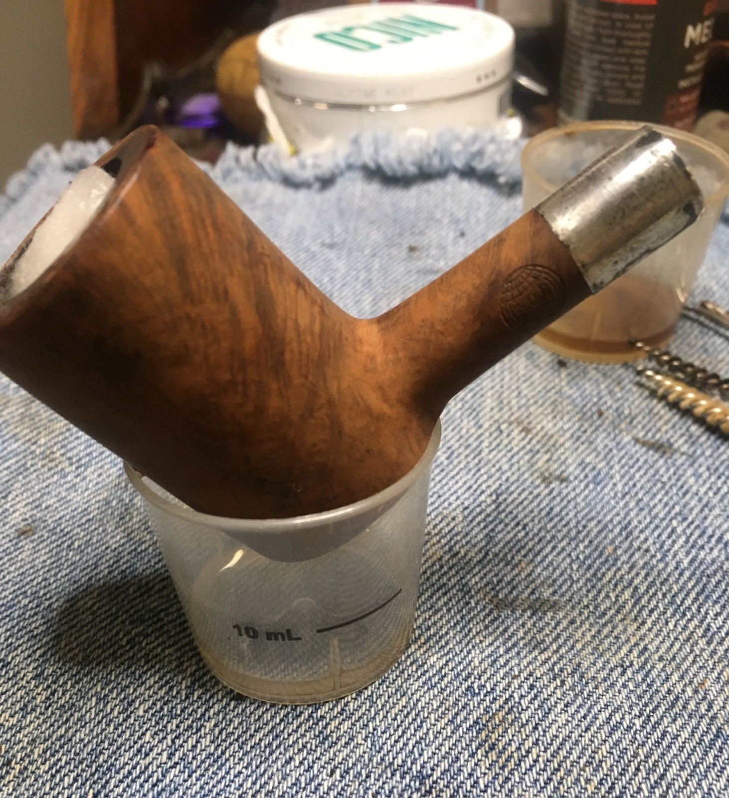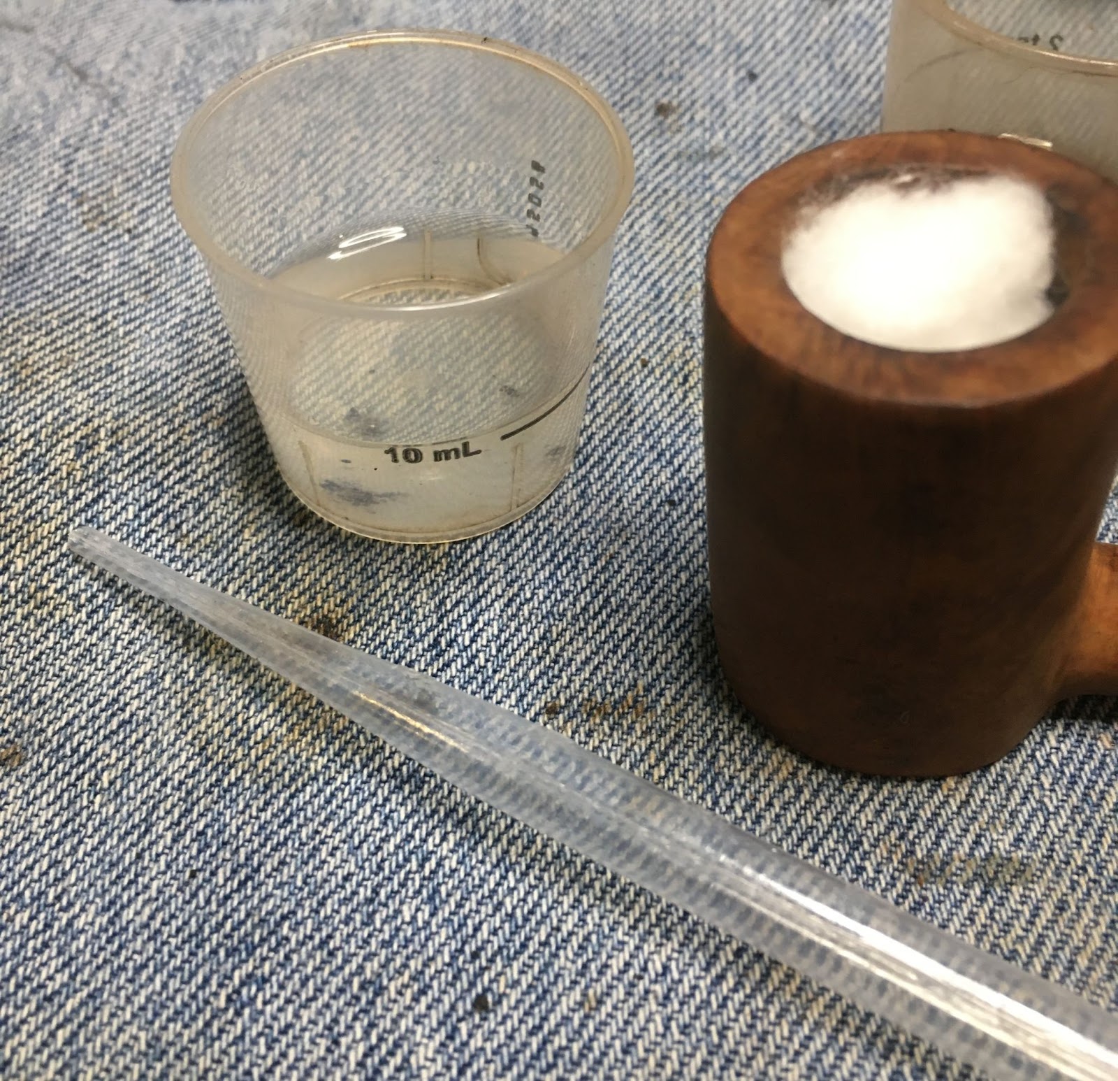 Next came the cleaning of the airway inside the shank. I only took one photo of the process. This makes it look like it was not as long of a process as it really was. I use a rotation for shank cleaning. First 3-4 ml of 05% ethyl alcohol is poured into the chamber. This is allowed to flow into the shank. I use a nylon shank brush to scrub the airway with the alcohol then pour the alcohol into a medicine cup. I then use either cotton swabs or a pipe cleaner dipped in alcohol to further scrub the airway removing the softened and dissolved tars. This is repeated using the same alcohol, if it is fairly clean, or fresh alcohol if it is heavily fouled with tar. Eventually the pipe cleaners/cotton swabs return less dirty and the airway is cleaned.