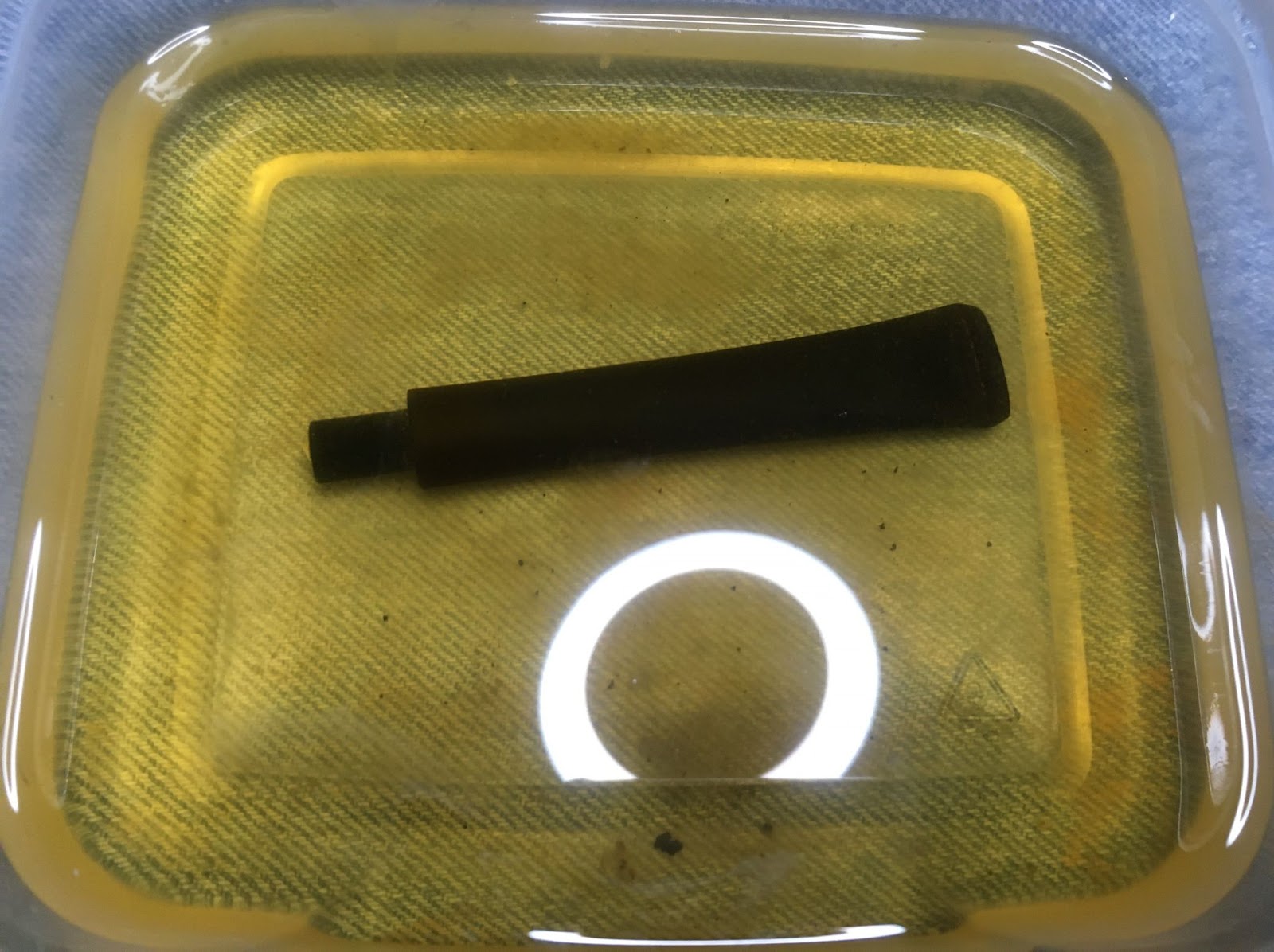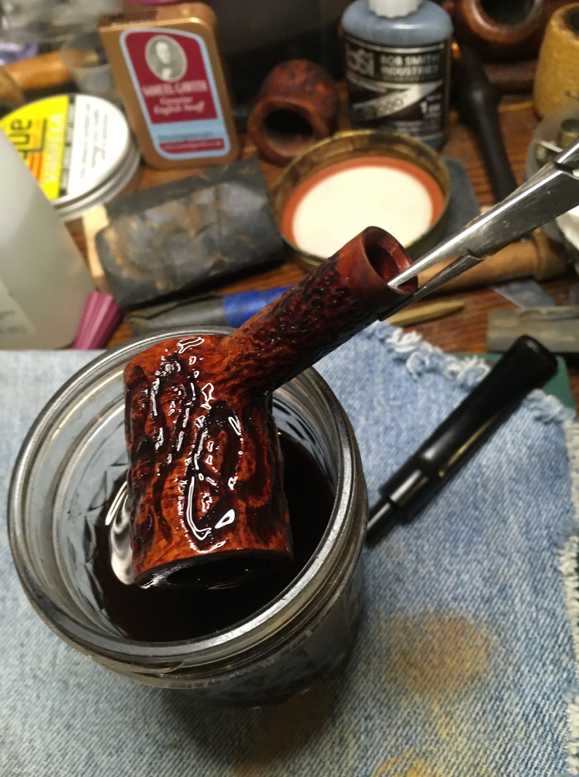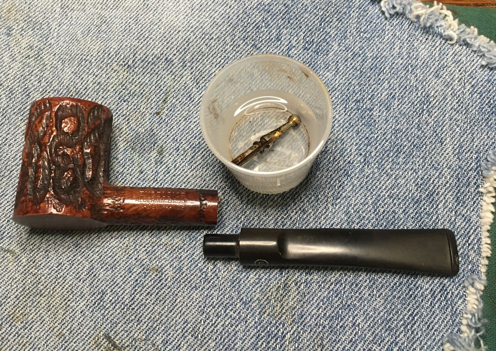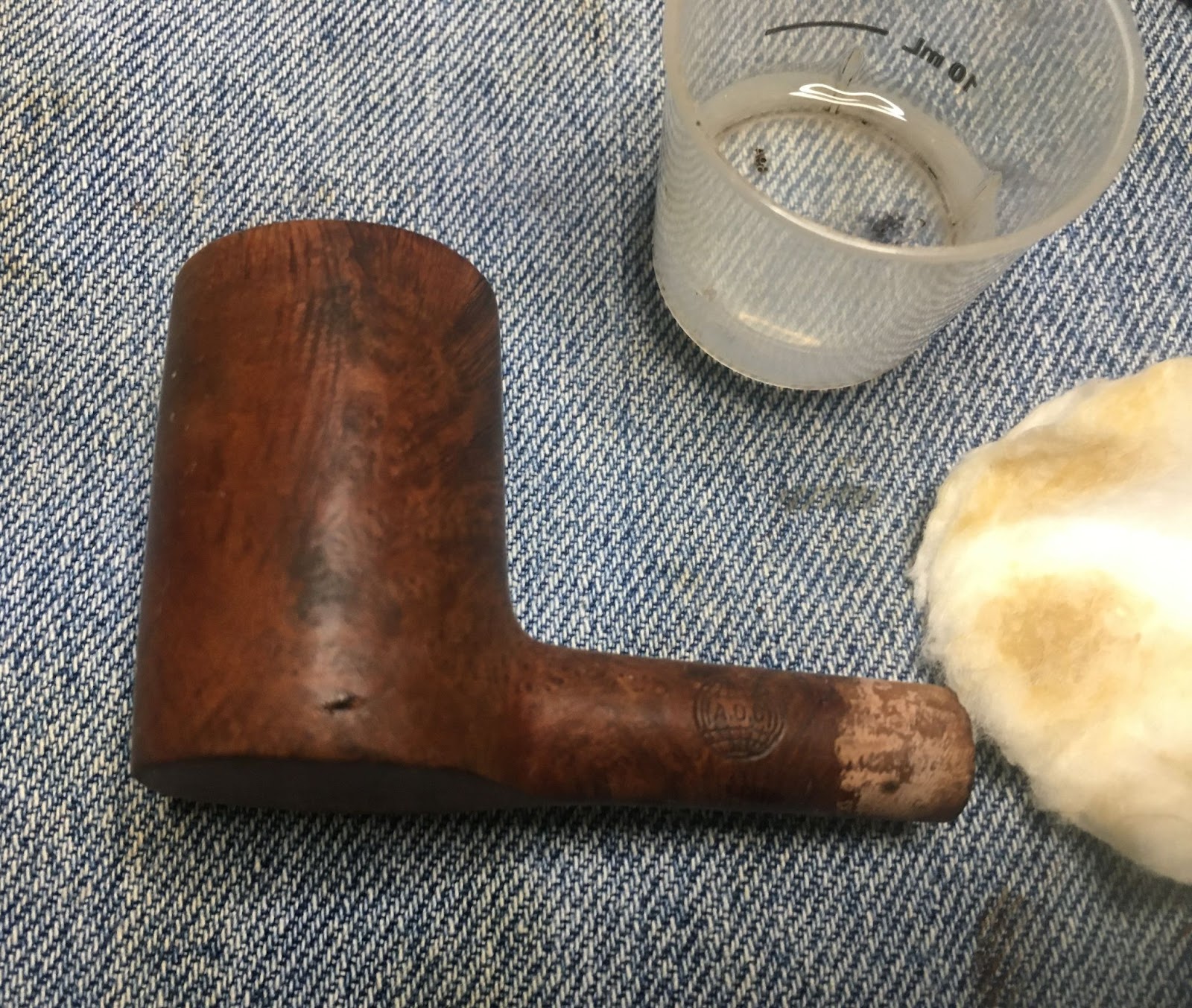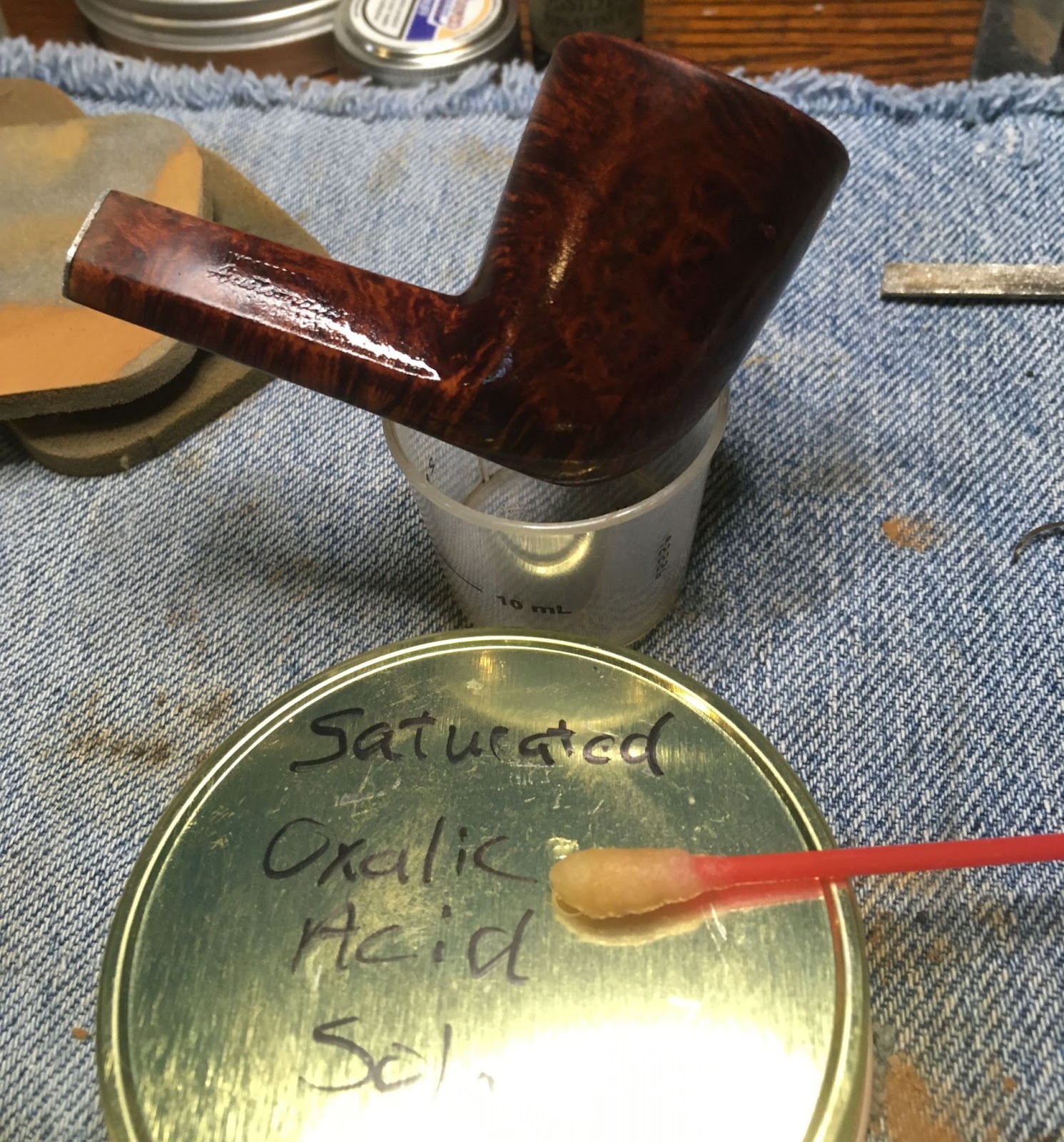 Next came the cleaning of the airway inside the shank. I only took one photo of the process. This makes it look like it was not as long of a process as it really was. I use a rotation for shank cleaning. First 3-4 ml of 05% ethyl alcohol is poured into the chamber. This is allowed to flow into the shank. I use a nylon shank brush to scrub the airway with the alcohol then pour the alcohol into a medicine cup. I then use either cotton swabs or a pipe cleaner dipped in alcohol to further scrub the airway removing the softened and dissolved tars. This is repeated using the same alcohol, if it is fairly clean, or fresh alcohol if it is heavily fouled with tar. Eventually the pipe cleaners/cotton swabs return less dirty and the airway is cleaned.