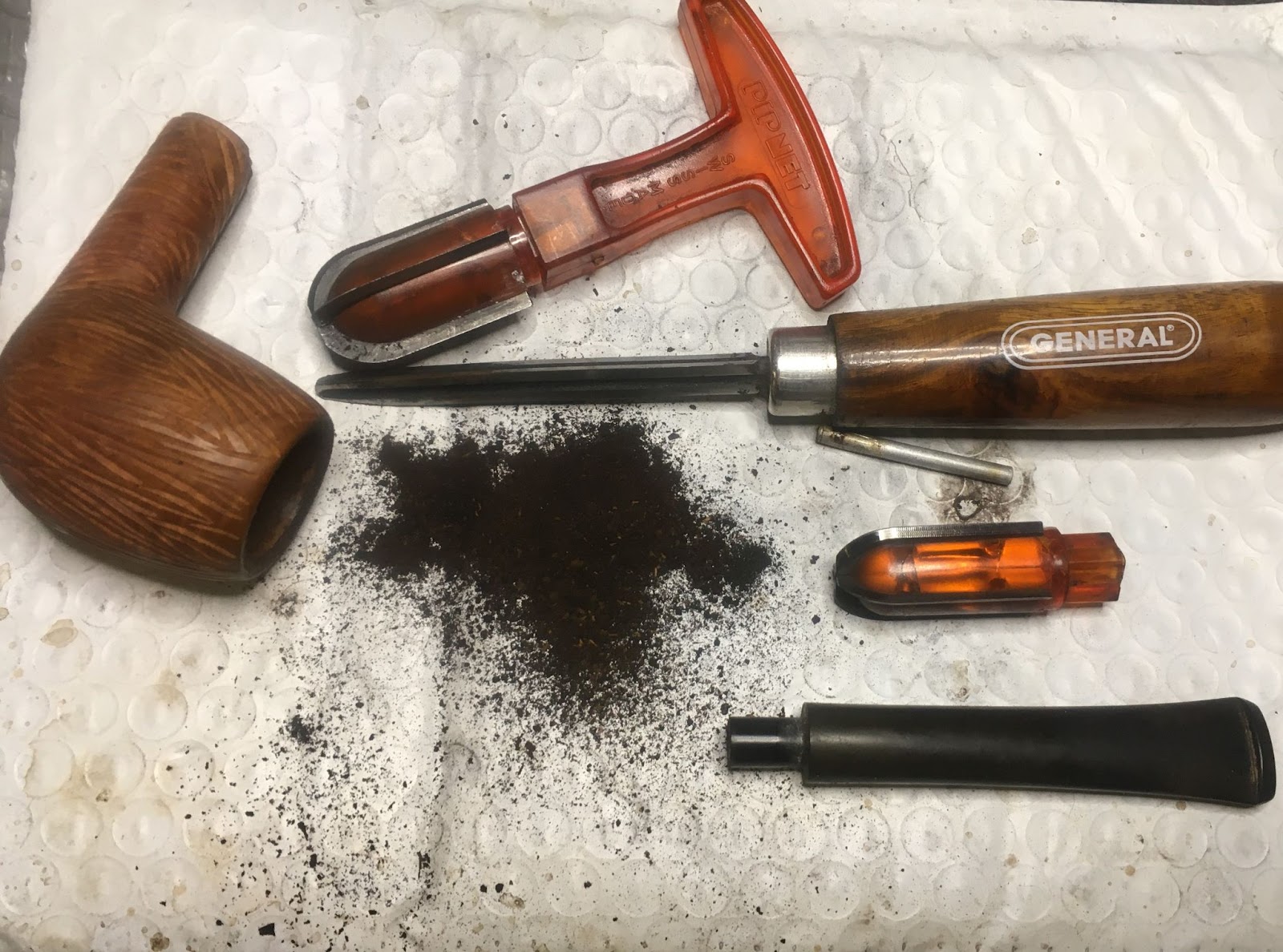 The reaming tools were gathered and put to work. The PipNet with the #2 bladed struggled a bit with the tight fit and hard cake. The General triangular scraper was used to open up the tobacco chamber and thi the cake allowing the PipNet to do it’s job.