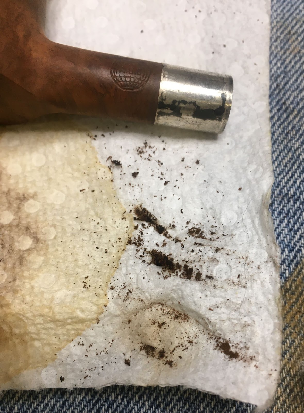 Back at the workbench I wiped the stummel with a make-up pad dipped in 95% ethyl alcohol. This came back stained bright red. The alcohol was dissolving the original stain and removing it.