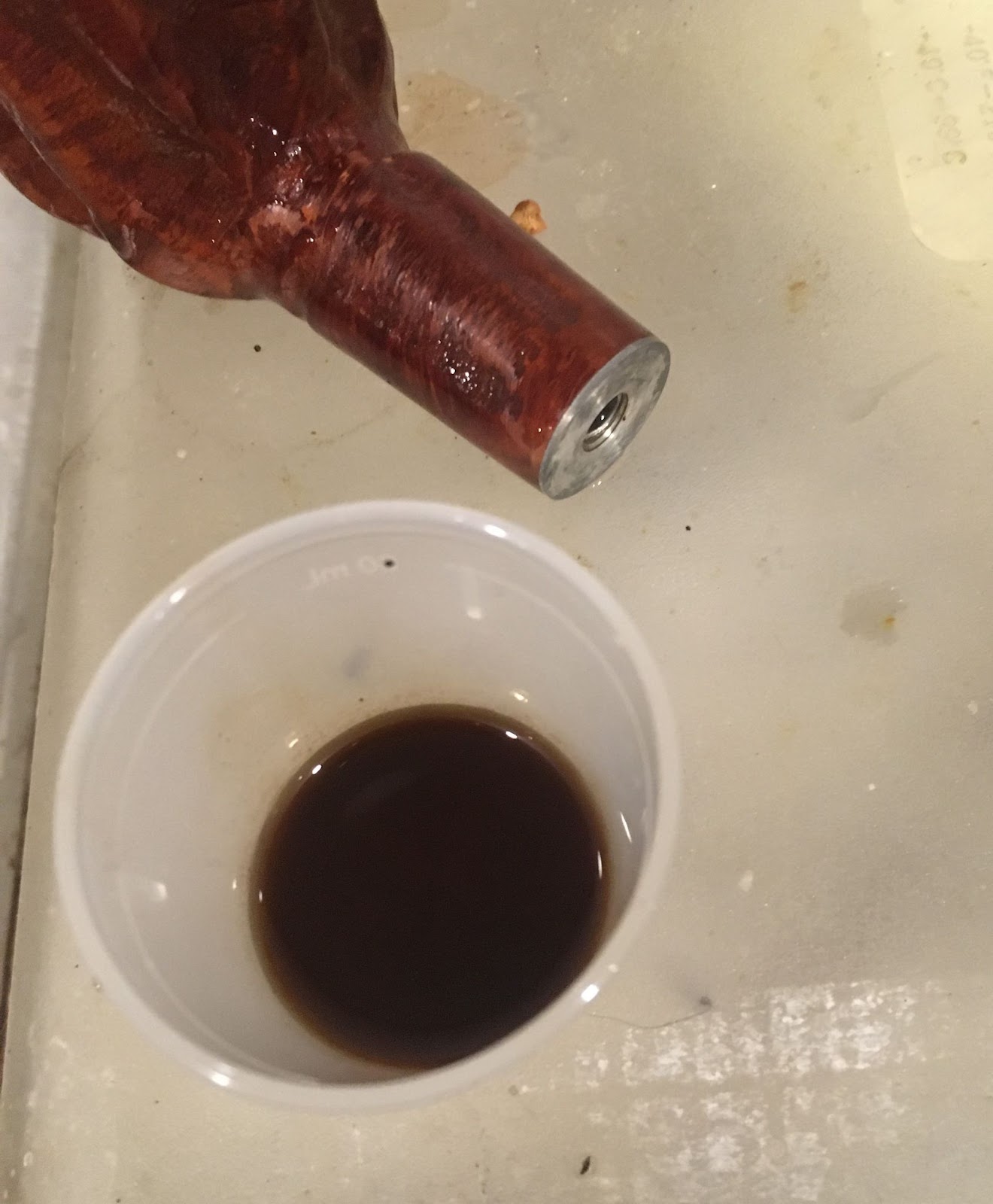 When finished drying I poured 5 ml of 95% ethyl alcohol into the tobacco chamber and allowed it to flow into the shank. Without pouring the alcohol out I used a nylon shank brush to scrub the airway within the shank with the alcohol. This alcohol was poured into a medicine cup. The color indicated the extent of the tar accumulation in the airway.