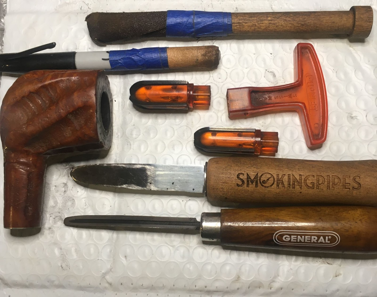 Looking back at my photos I apparently neglected to photograph the reaming of this HandMade. Don’t worry, you are not missing much. This pipe had been smoked very little as you will see when I describe the shank cleaning. The reaming was very quick and uneventful. I used the PipNet with the #3 blades to barely mess up my plastic drop surface. The scraper and knife were not used and the tobacco chamber was sanded with 220 sandpaper on a wood dowel followed by 320 sandpaper wrapped around a Sharpie marker. The most interesting part was that there was a shallow groove inside the chamber that ran along the left side. I remembered that the second Kaywoodie HandMade also had a groove in it’s chamber. Upon looking very closely at both with a bright flashlight I saw what appeared to be a thin crack in both chambers. It did not go from the top to the bottom; rather it was about ½ to ¾ inches long in the center of the chamber on both pipes. It almost looked like it was a crack from improper drying or the chamber was bored out while the wood was not completely dried. I then remembered that both of these pipes had come from Las Vegas Nevada, a place not known for their humidity. Perhaps years of storage in the desert had not been good for the pipes. Either way I thought it would be best to mix up some J.B. Weld and fill the crack from within the chamber. Allow the epoxy to set and sand it smooth with the chamber surface. I thought that I would come back to do that step with both pipes when I was finished with the restoration.