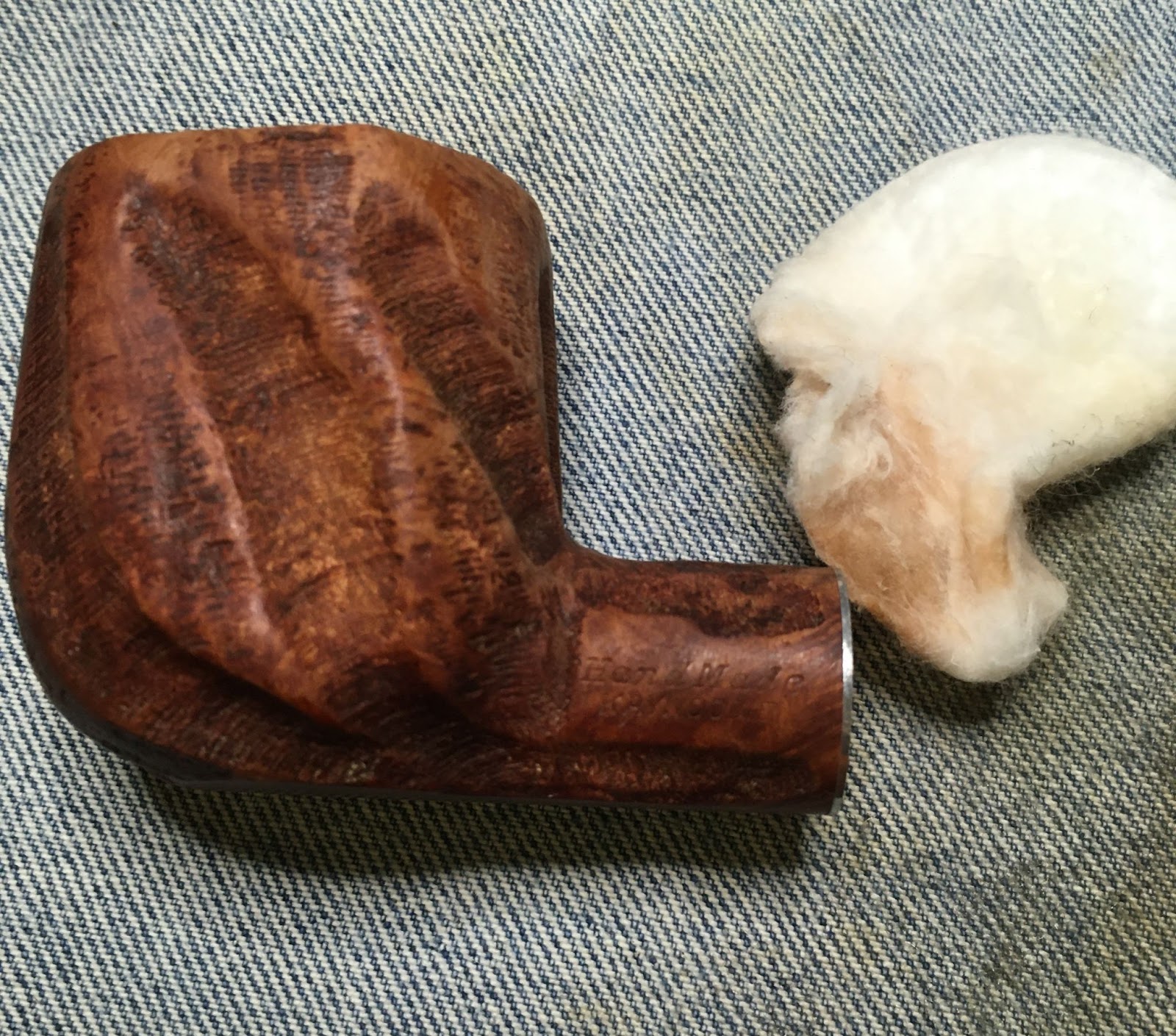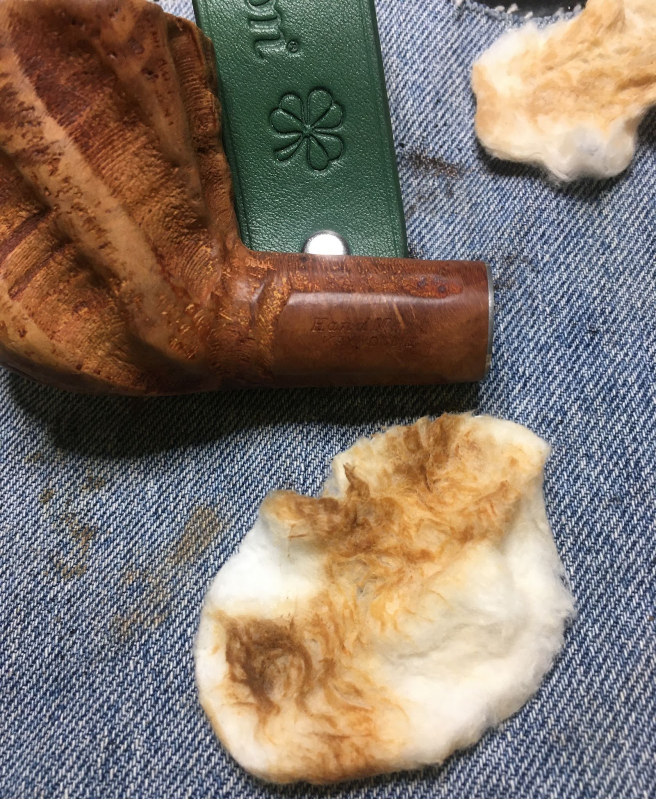 With the internals cleaned out I returned to the exterior of the stummel. There seemed to be some yuck (the technical term for unwanted debris) in the grooves of the carvings. I wetted a make-up pad with 95% ethyl alcohol and wiped-down the exterior of the stummel. Very little color came off.