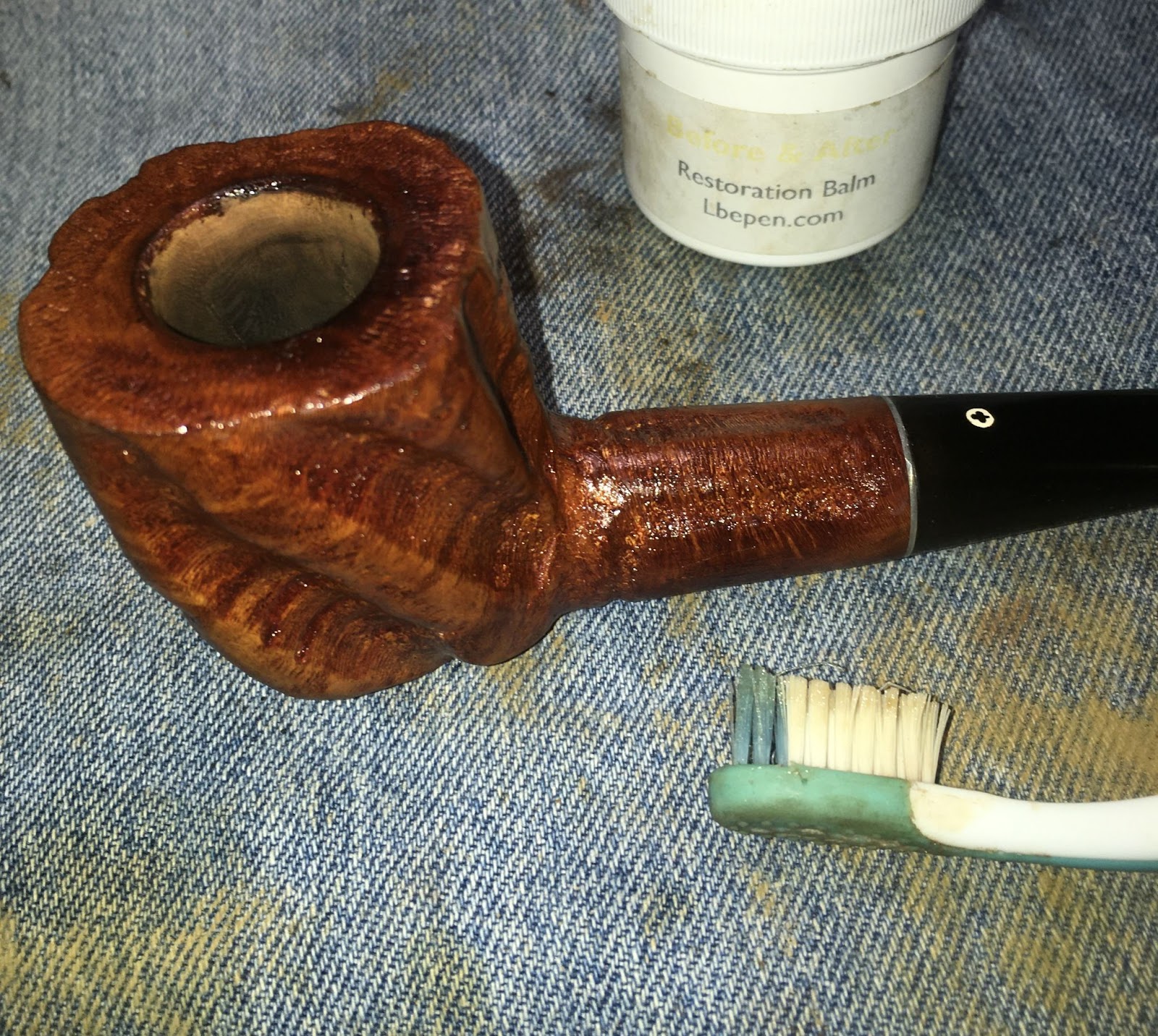 In the morning the Restoration Balm was hand buffed from the stummel using the inside of an athletic sock. The terrycloth of the sock worked excess balm from the rustications of the carvings and left a very pretty shine on the stummel.