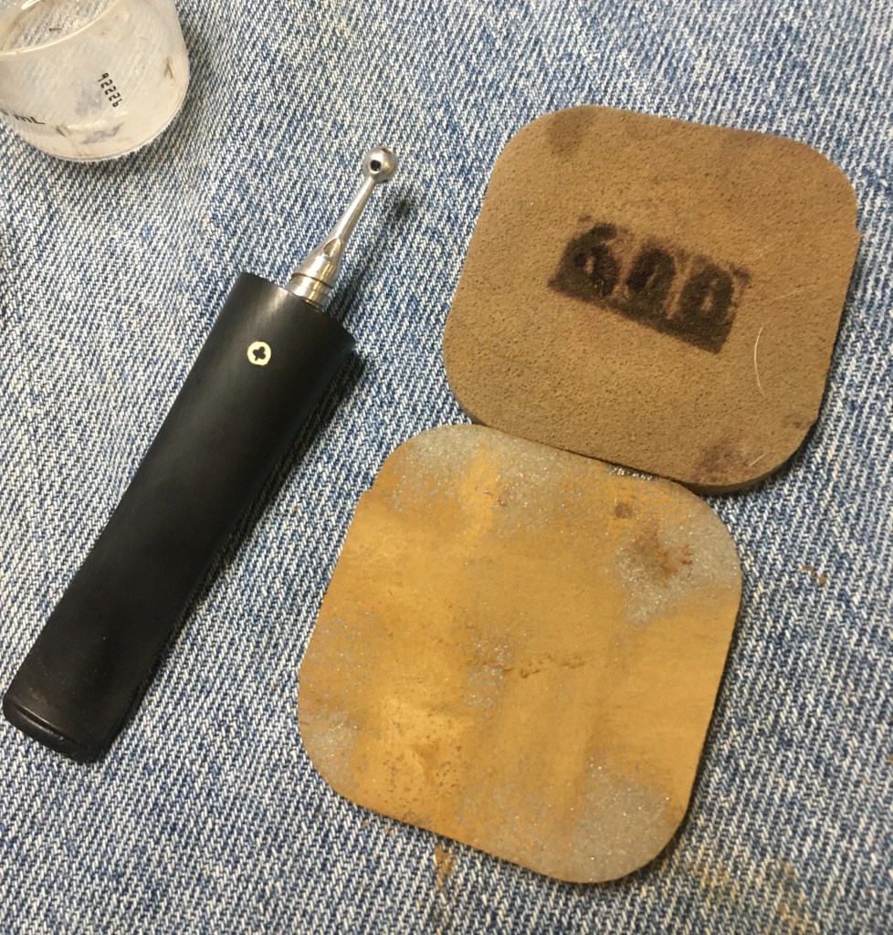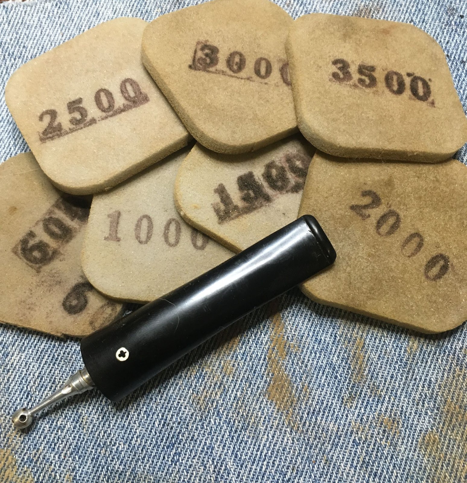 After the sanding I started to micro-mesh the stem. Here I used the 4000-12000 micro-mesh pads in sequence. Between each pad I applied a drop of Obsidian Oil. The oil was rubbed in with my finger and wiped away with a paper towel.