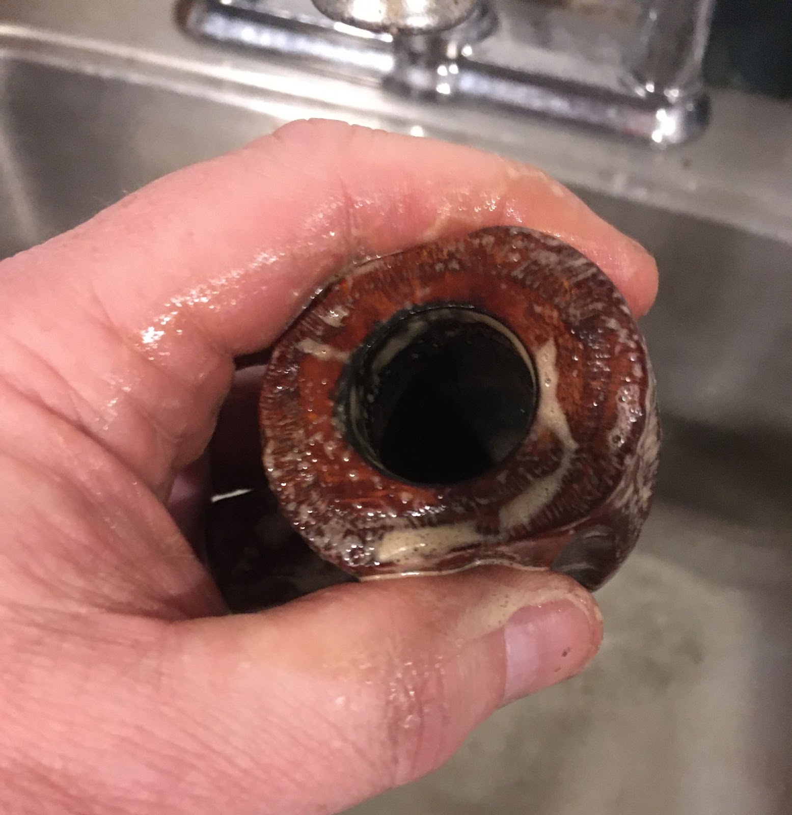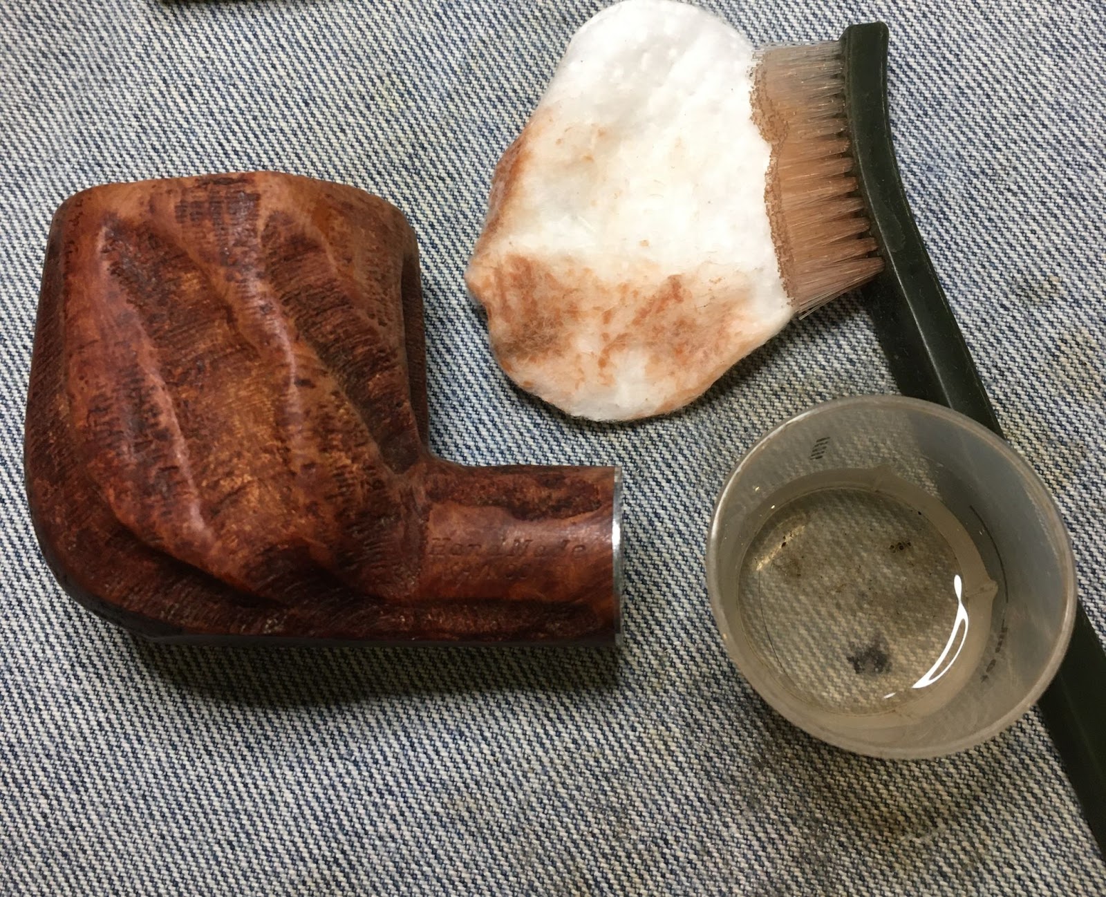 I took the stummel to the sink. There I scrubbed the stummel with undiluted Murphy’s Oil Soap and a medium bristle toothbrush. The years of dirt and grime were evident in the lather. The stummel was rinsed in warm water and dried with a cotton dish towel.