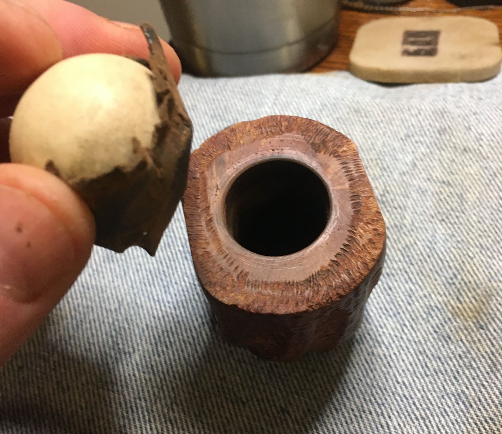 Now to deal with that charring. I used a wood sphere with a piece of 220 sandpaper. The sphere provided an even angle for a bevel and erased the charred briar. THe bevel was then sanded smooth with the sanding sponges by using the 400, 1000, 1500 and 2500 sponges in sequence.