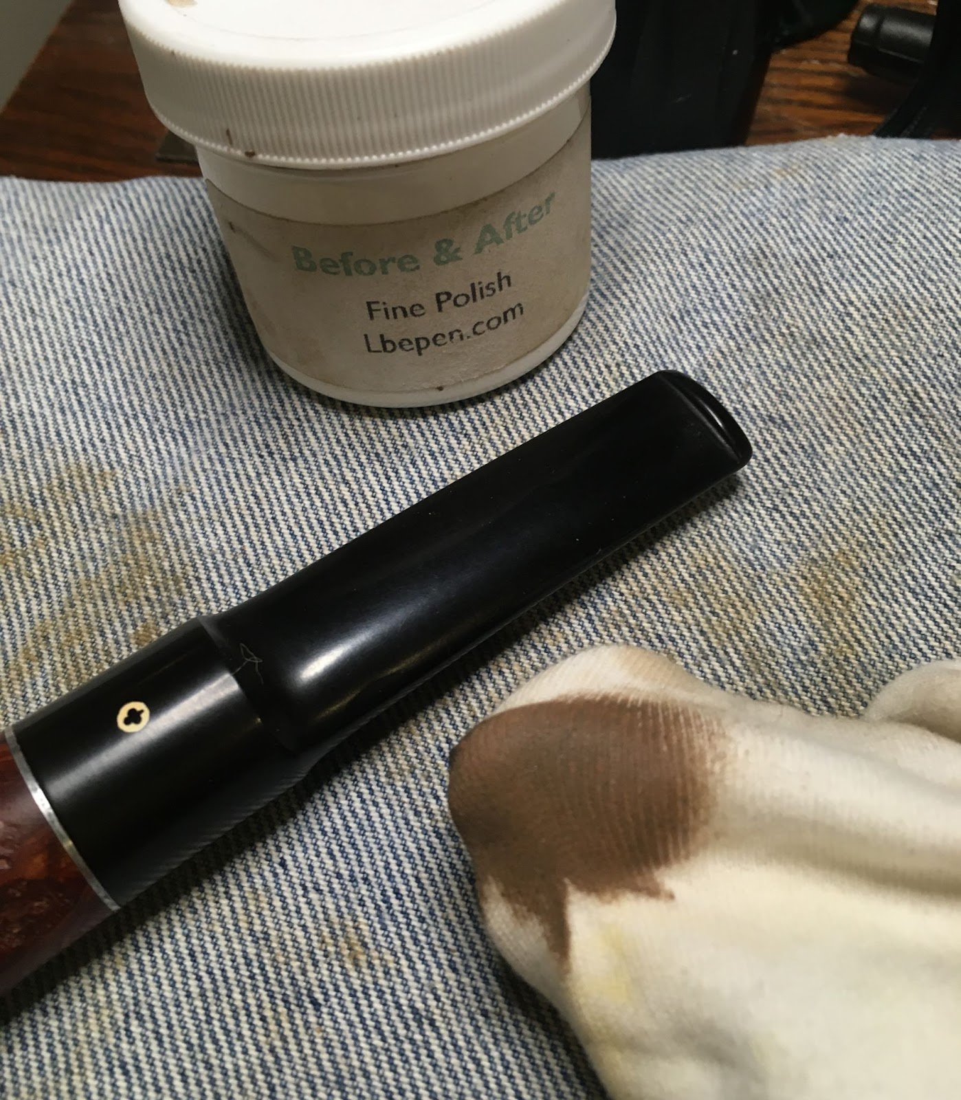 The final steps in polishing the stem were done with Before and After Fine and Extra Fine Polish. The polish was applied by finger tip and hand rubbed with a soft cotton rag. Fine Polish followed by the Extra Fine Polish.