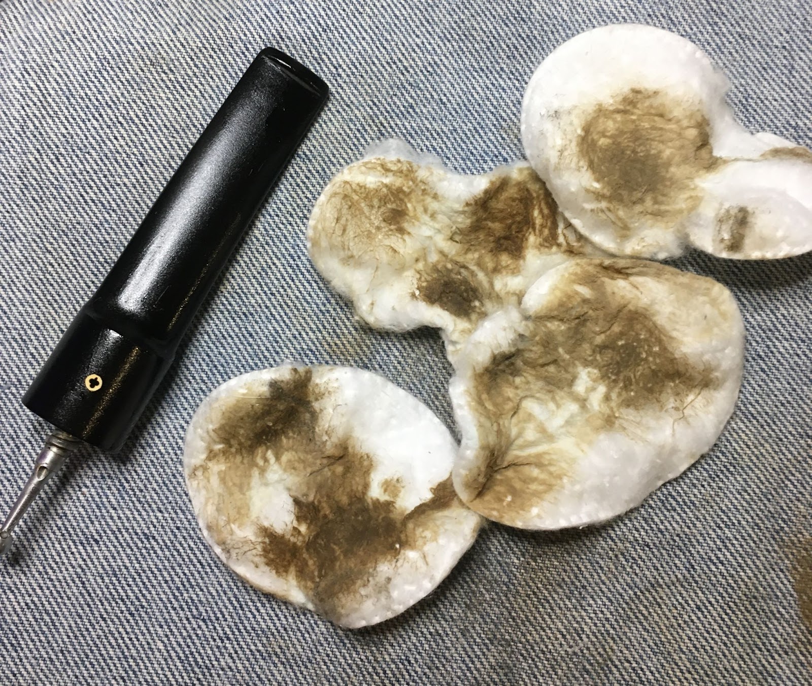 I then used a stiff nylon bristle brush dipped in the alcohol to scrub the carvings. Again I wetted a make-up pad and wiped the surface. This time the grooves looked deyuckified and it showed on the make-up pad.