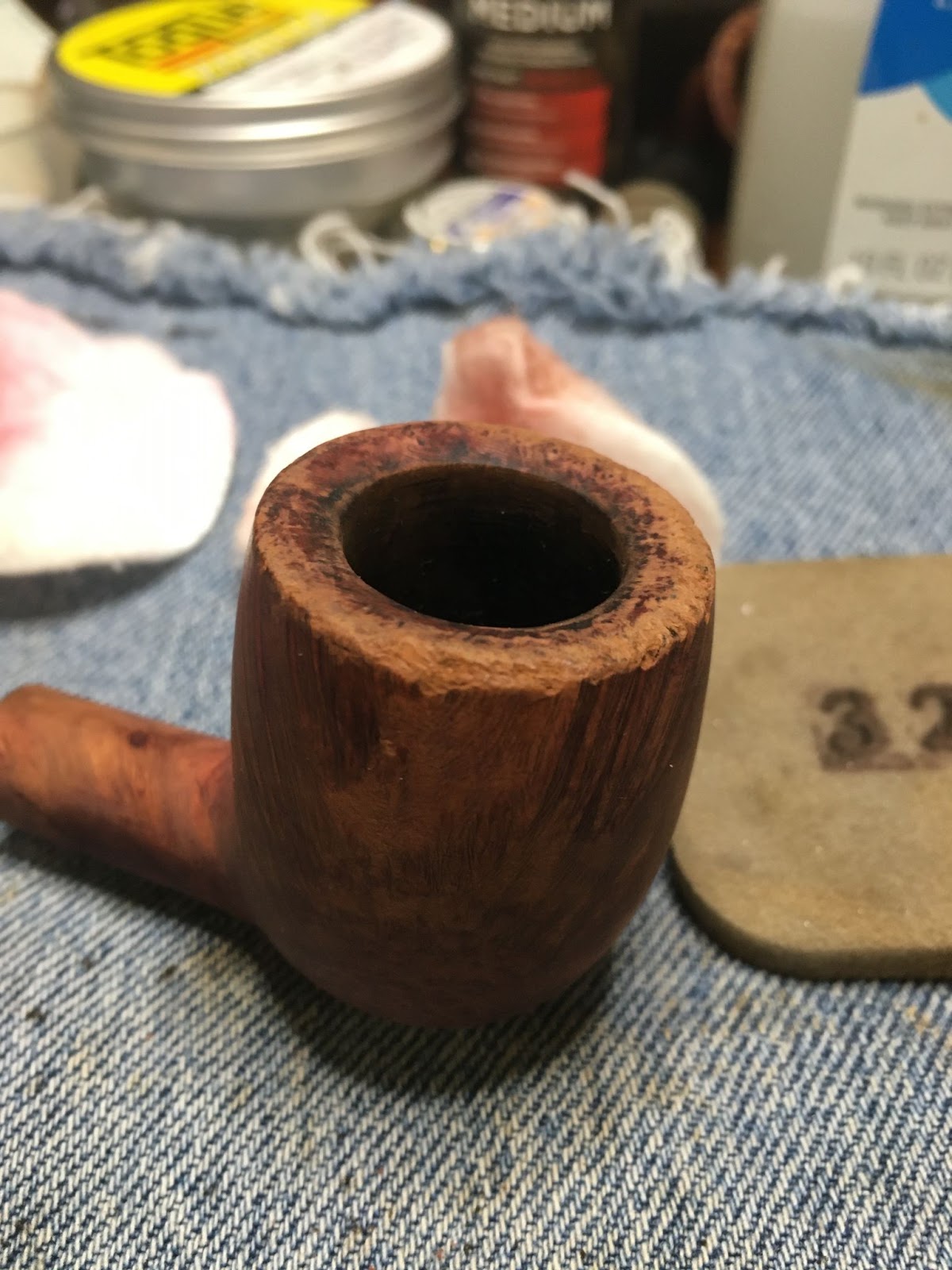 Returning to the workbench the stummel was wiped with a cotton make-up pad wetted with 95% ethyl alcohol. Some further grime, wax and perhaps stain was removed with the pad.
