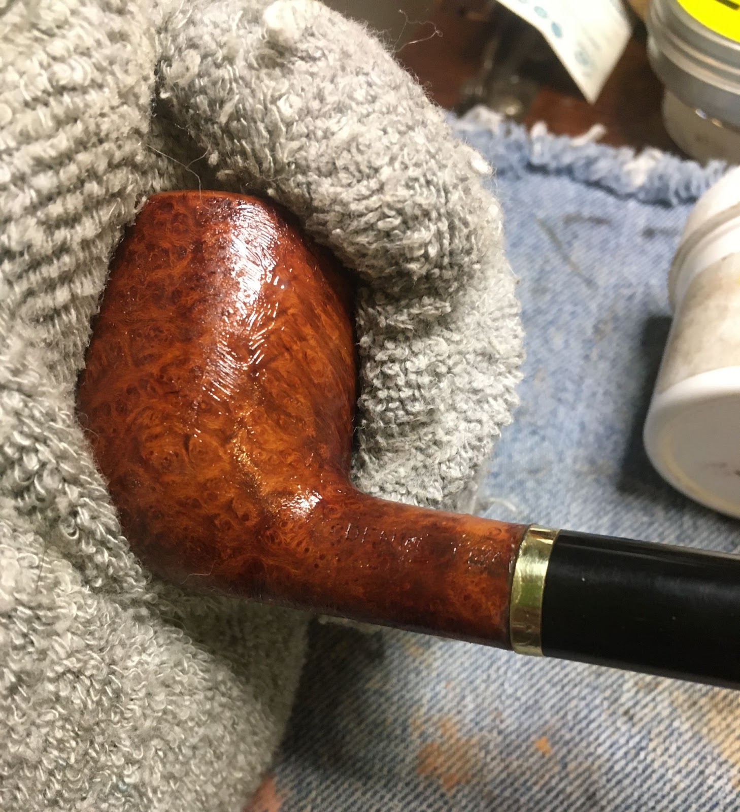 The final step was to take the pipe to the buffer where it received several coats of carnauba wax. After the wax was applied and buffed I hand buffed the pipe with a nanofiber polishing cloth in an attempt to improve on the already exquisite shine.