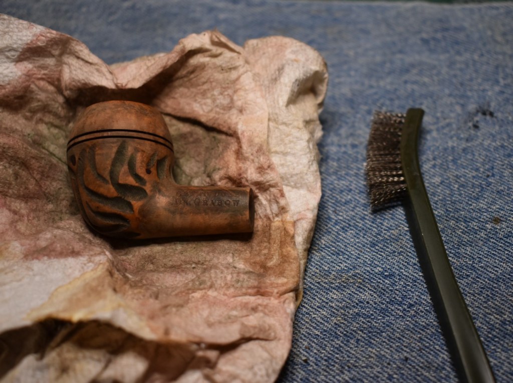 that they will re-harden with the evaporation of the acetone. That is exactly what this one was doing. I took a couple of paper towels and folded them in half to absorb the spent acetone. I then used a steel brush dipped into the acetone and lightly scrubbed the stummel. The brushing with wet acetone worked very well at removing the finish.