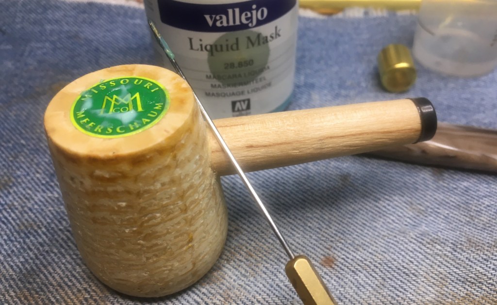 I wanted to maintain the Missouri Meerschaum logo sticker so I covered it with Vallejo Liquid Mask. This is a quick drying latex that is used to keep paint from areas where it is not wanted. Once dried it can be easily peeled off.