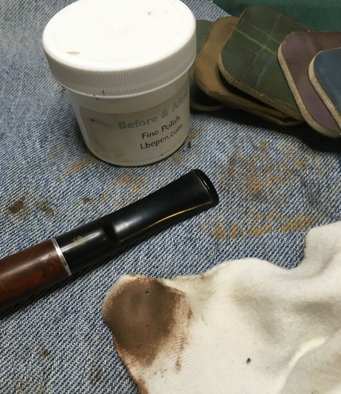 The pipe was ready for the micro-meshing. I used the 4000-12000 micro-mesh pads. Between each pad I wiped the stummel with a make-up pad wetted with alcohol and the stem received a drop of Obsidian Oil rubbed in by fingers and wiped with a paper towel.