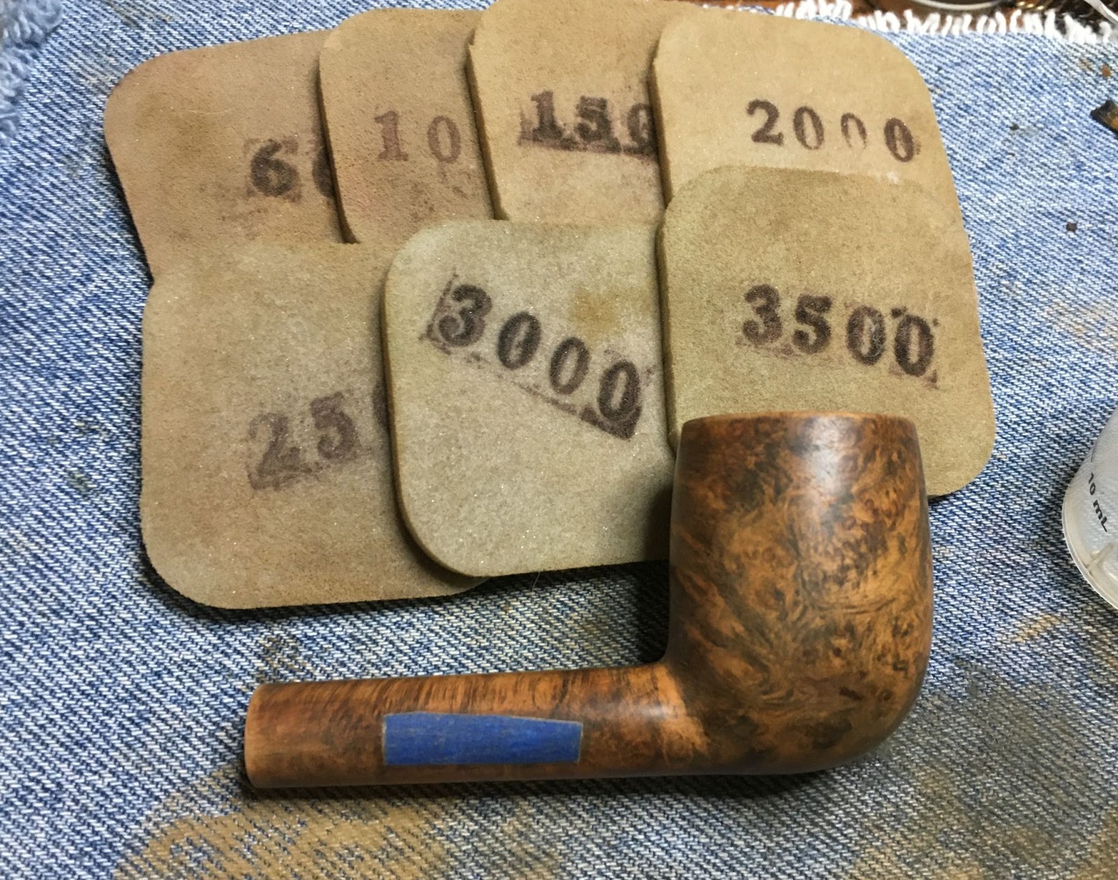 The stem and stummel were sanded intact to avoid the rounding of the edges of each part. A series of sanding sponges from 400-3500 grit. Between each sponge I wiped the stummel with a make-up pad moistened with alcohol. The stem was rubbed with mineral oil and wiped with a paper towel.