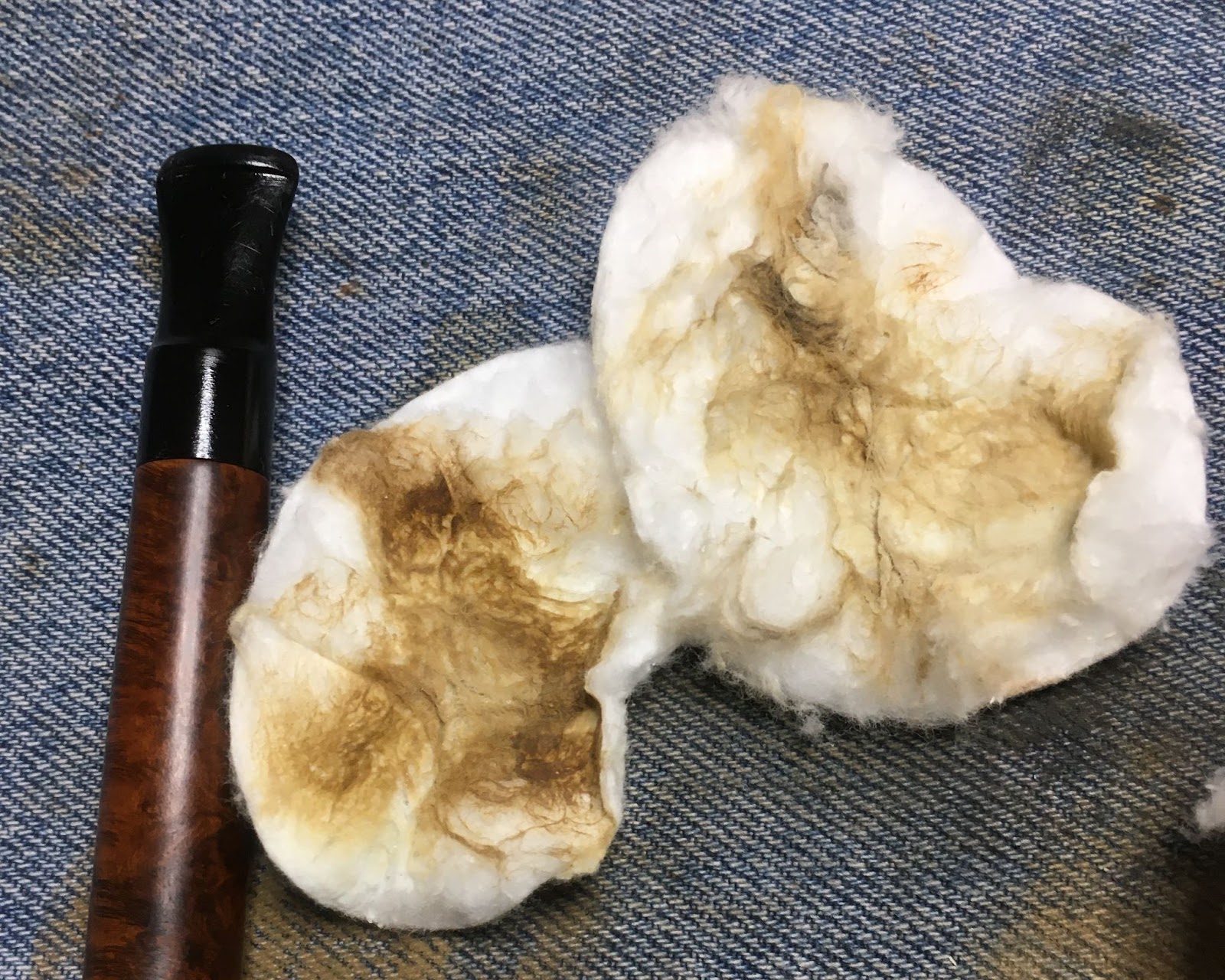 Returning to the workbench the stummel was wiped with 95% ethyl alcohol on a couple of make-up pads. This removed some of the finish and stain.