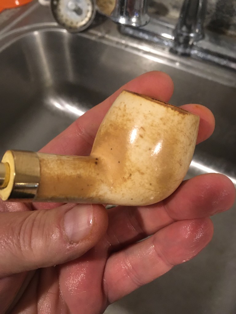 Hmm, it sounded like a reasonable plan but like all of my plans, they tend to have trouble when exposed to reality. You may be wondering, “What the heck is egg white used for?” There is a technique for repairing meerschaum pipes using powdered chalk mixed with eggwhite. I have used this technique previously in the restoration of a Kiko Caveman (Kiko Caveman Restoration – NebraskaPeteGeek). In that blog post there is the original recipe and instructions as well as an exchange between me Dal Stanton and Paresh Deshpande regarding the durability of the repair. I now have a small supply of meerschaum pieces so I planned on replacing the chalk with meerschaum powder.