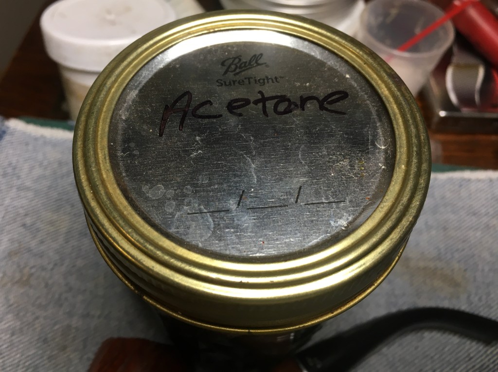 The next step was to clean the airway of the shank. 95% ethyl alcohol, cotton swabs, bristle pipe cleaners, a nylon shank brush, and a small rat tail file with a paper towel wrapped around it.