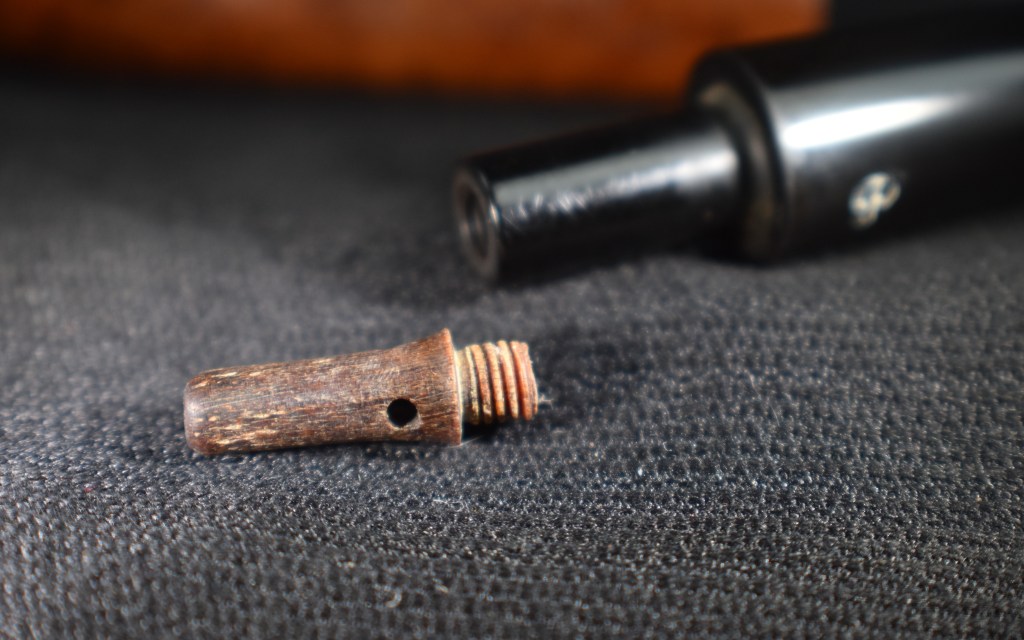 I used a small flat file to round the entire chimney. I then filed the tip down a bit removing about 1 mm of material. Instead of removing the entire chipped part and shortening the chimney, I opted to build up the tip using brown Cyanoacrylate (CA, super glue). The glue seemed to penetrate into the pores of the bone. I thought this would be good for strengthening the entire piece. The CA was spritzed with a drying accelerator. Then filed. The draft hole was opened up with a diamond needle file and the edges of the tip were slightly rounded with the flat file. The below two photos show the finished shape of the chimney.