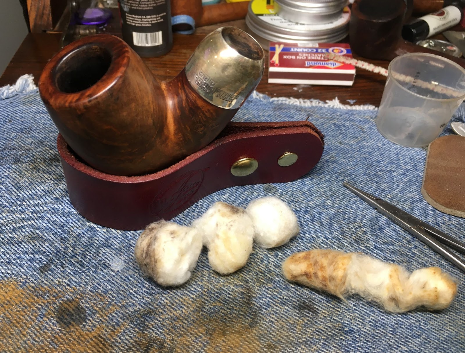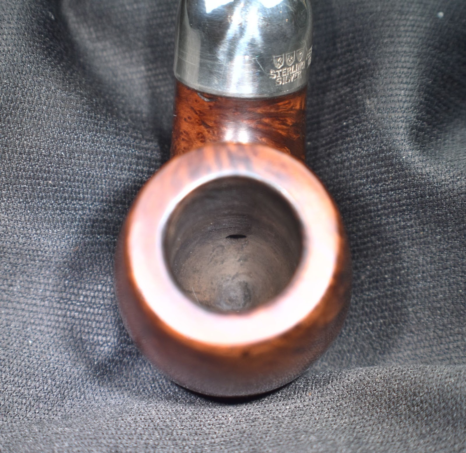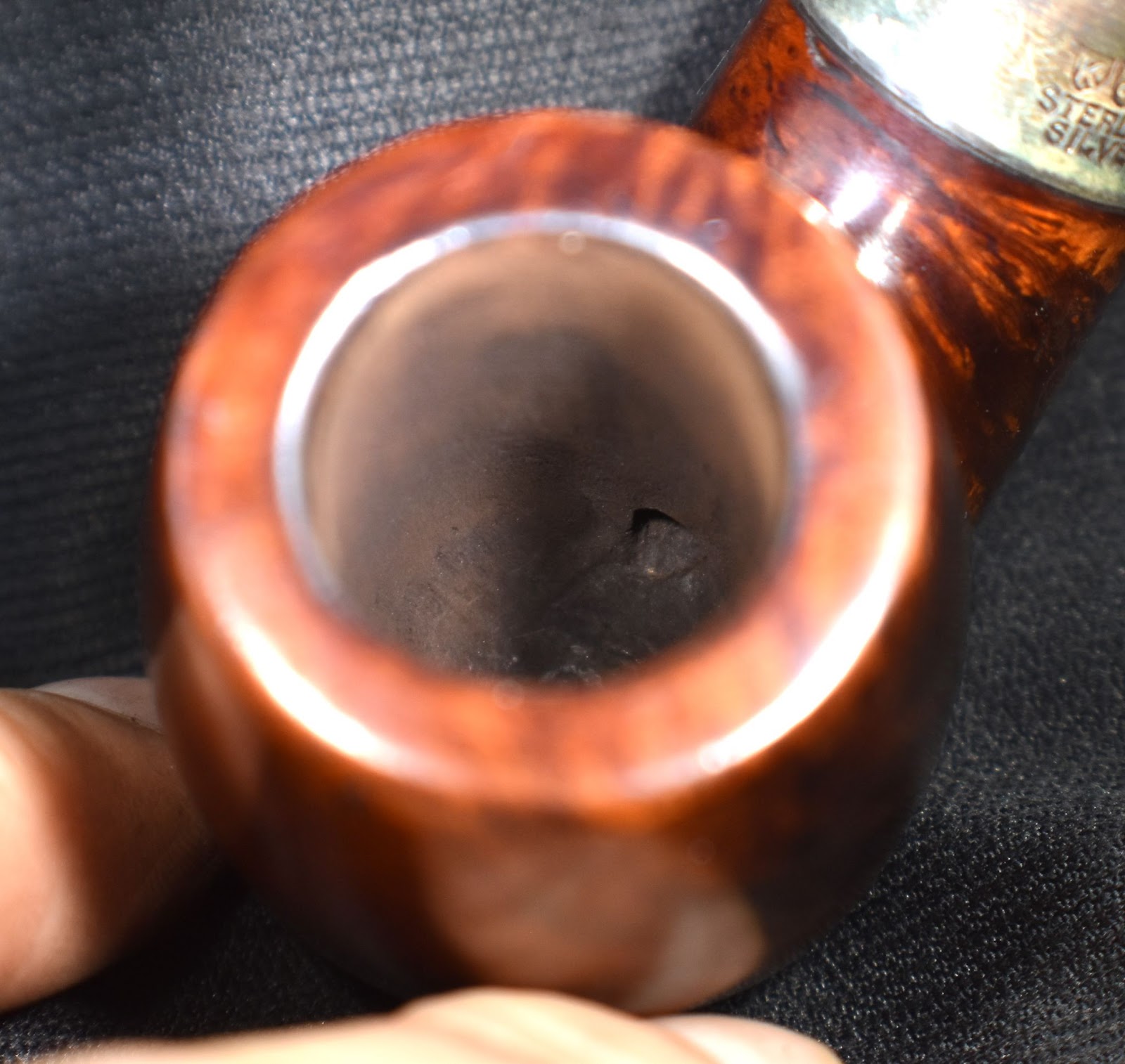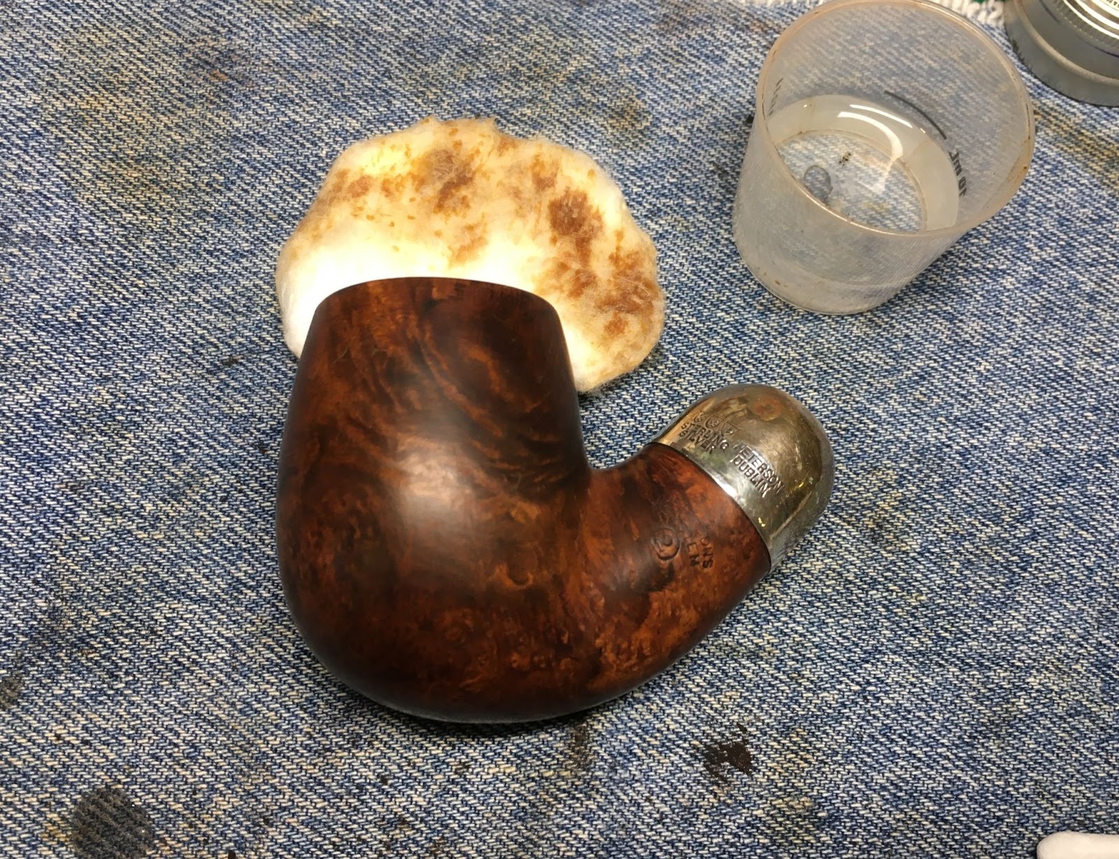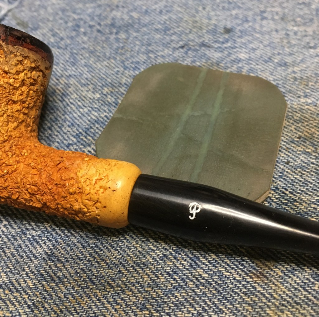A quick wipe with 95% ethyl alcohol removed no stain indicating that this was a virgin finished pipe. The stain on the make-up pad was mainly from smoking residue around the mortise.