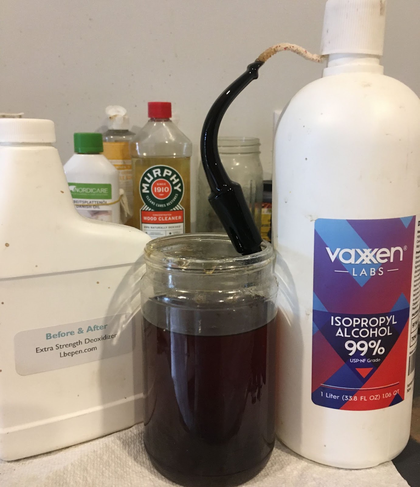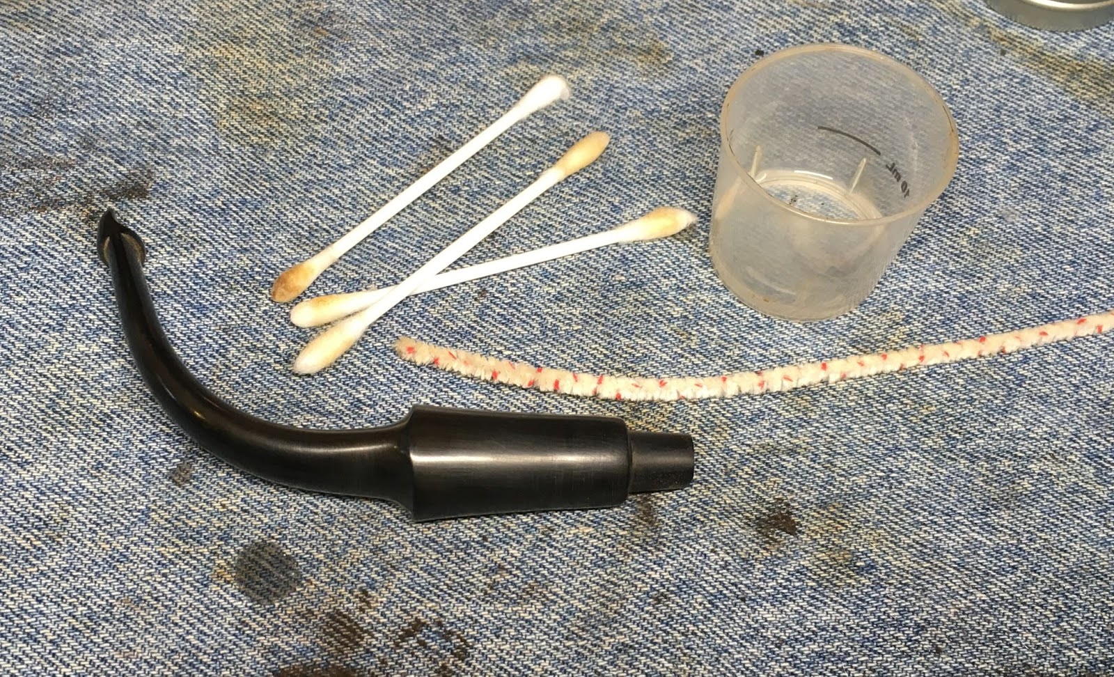 The stem was rubbed with 0000 steel wool to remove the outer hardened oxidation. A pipe cleaner was inserted into the stem to act as a hanger for the stem’s bath in Before and After Extra Strength Deoxidizer.