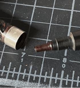 Oh, dang it, I forgot about the stinger, again. It had been sitting in a medicine cup with some 99% isopropyl alcohol. The alcohol softed the tar-lacquer (not sure if that is a thing). I used the buffer with some white compound to polish it up then reinserted it into the stem.