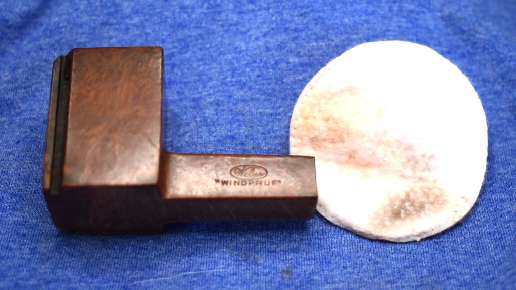 and calcium deposits were the only issues. I started by scraping the button edges with a sharp knife. Then gave the stem an energetic rub with 0000 steel wool to remove the calcium and outer oxidation. After the steel wool, I started rubbing the stem with Soft Scrub with Oxy-Clean on make-up remover pads. These came back with the dark golden brown indicating that they were removing oxidized vulcanite. I continued this until I was satisfied with the color of the stem. Since there were no dents requiring sanding I thought that I’d just use white diamond buffing compound and the buffer to polish the stem. It looked good so I gave it a drop of Obsidian Oil rubbed in with my fingers.