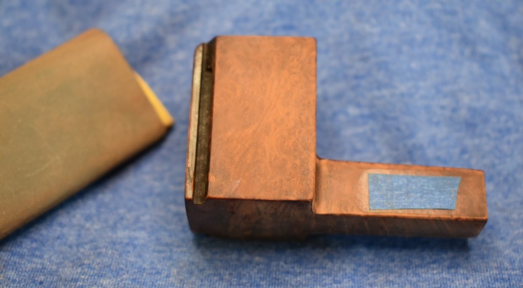 Returning to the workbench I could now see the damage done to the rim. Hmm, topping this rim would take at least an ⅛ inch or 3–4 mm off the top. I decided to give the rim a slightly “canted” appearance by filing the front off the stummel then reestablishing the beveled rim by sanding with a 1 ½ in PVC pipe cap topped with sandpaper. The newly sanded rim was then stained with Maple colored furniture repair stain pen. This was blended in with an alcohol soaked make-up pad.