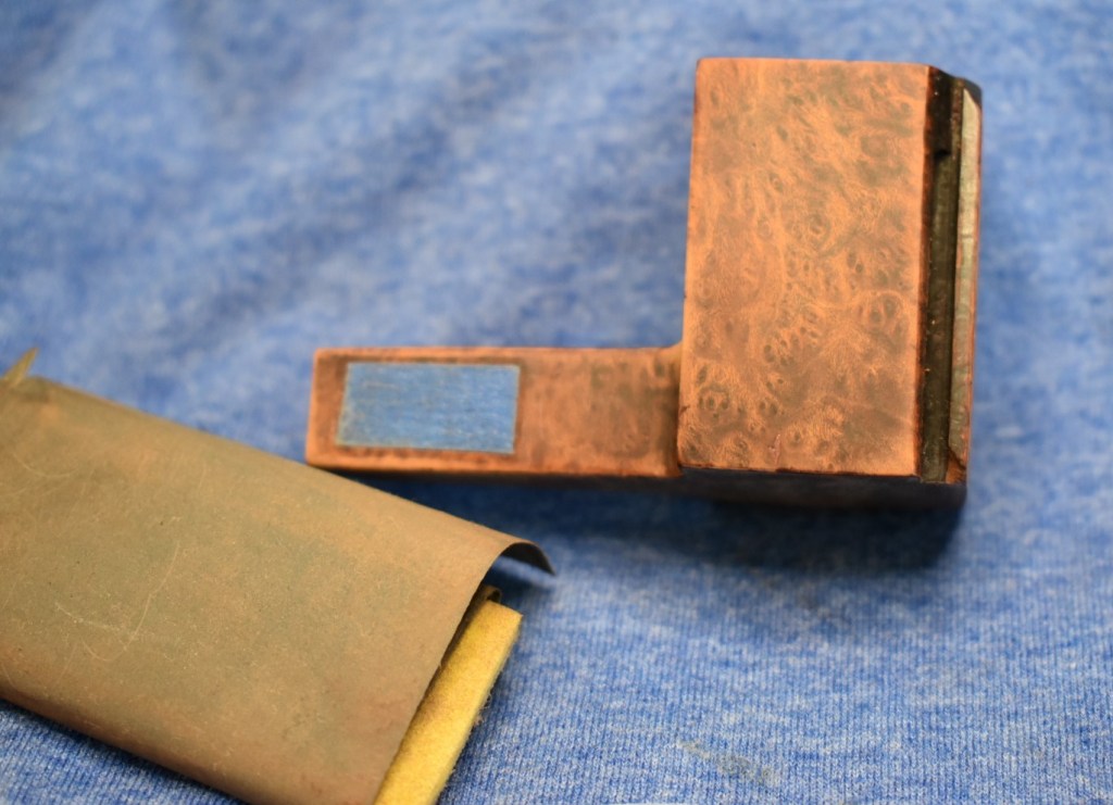 I started thinking about what shade of brown to use. I thought of a nice dark brown Fiebing’s Leather Dye as a base color with maybe a light brown for the high areas after I sanded away the dark brown from the high spots. It sounded good. I assembled the staining gear. Nitrile gloves, a lighter, a folded