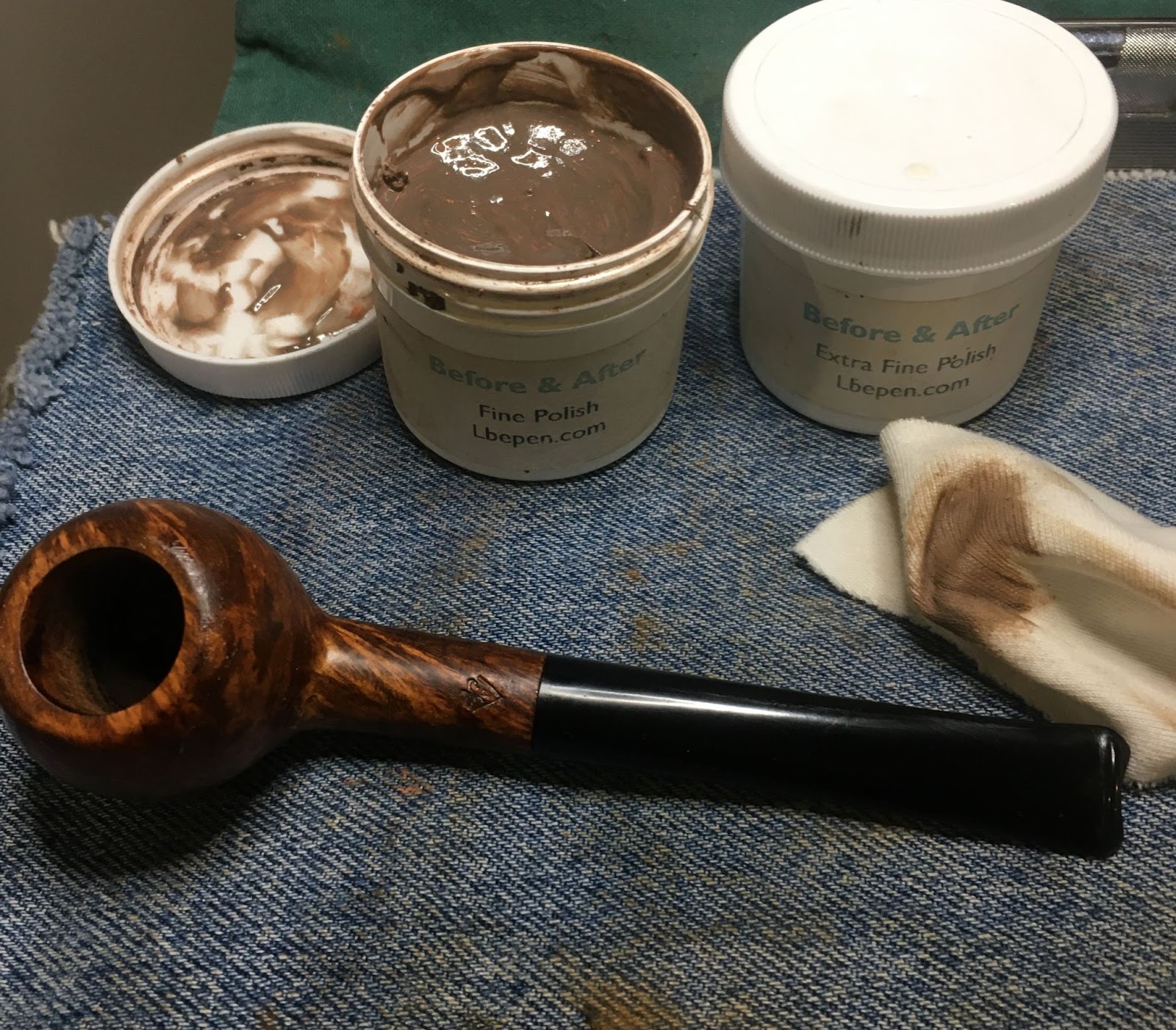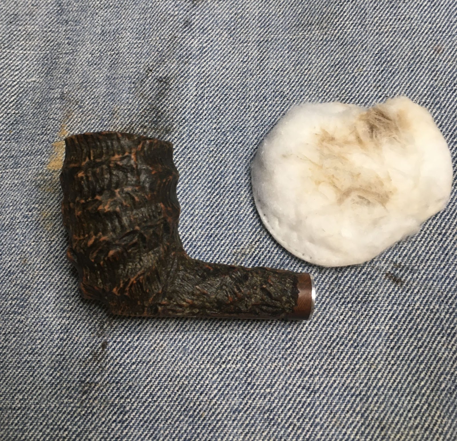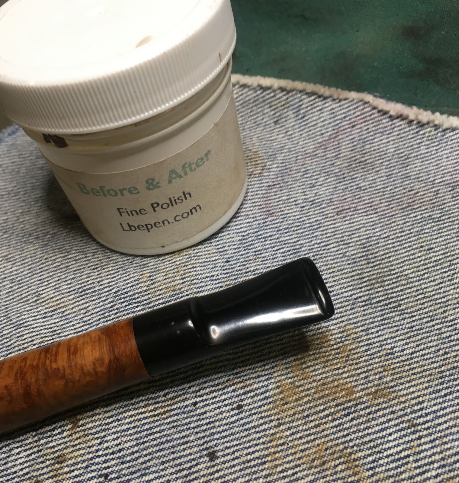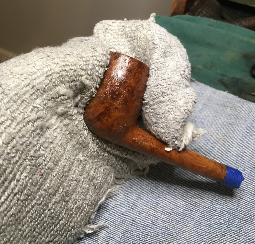 then rubbed in with a baby toothbrush. The was was allowed to dry for 2 hours then rubbed with a clean terry cloth towel. I took the pipe back to the buffer and applied a couple of coats of carnauba wax to the stem and the smooth stamp area on the shank.