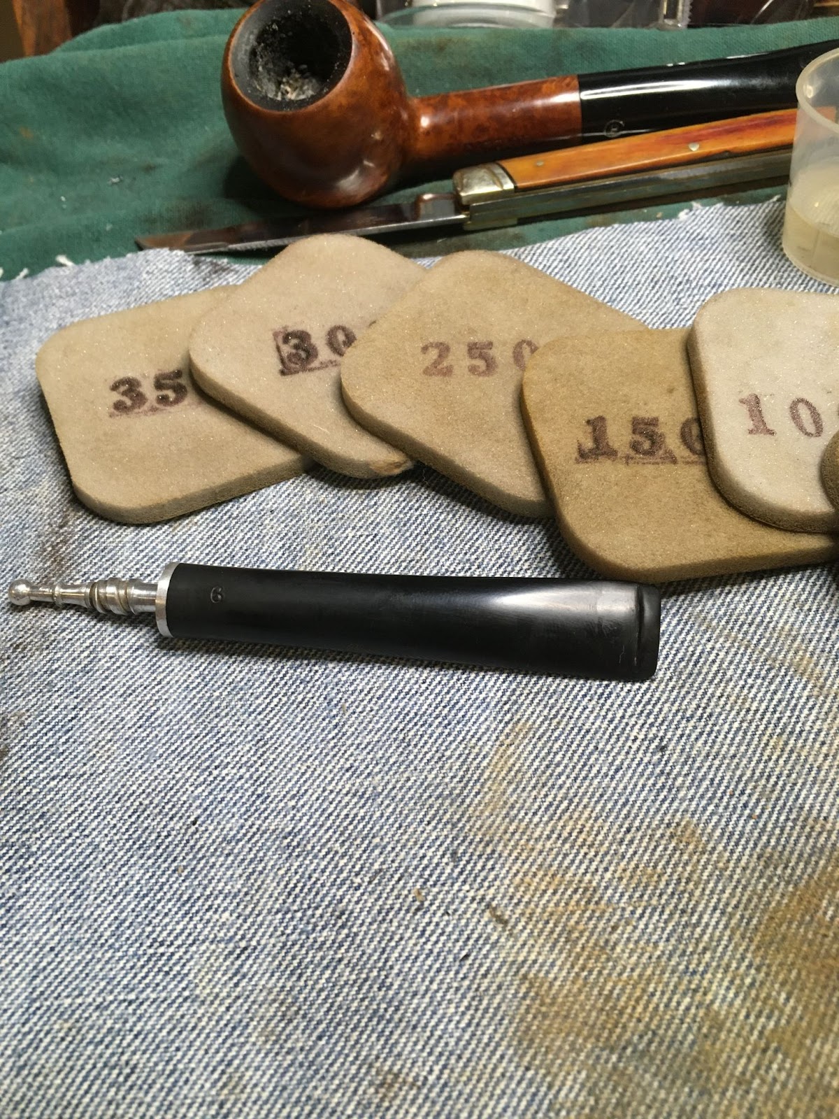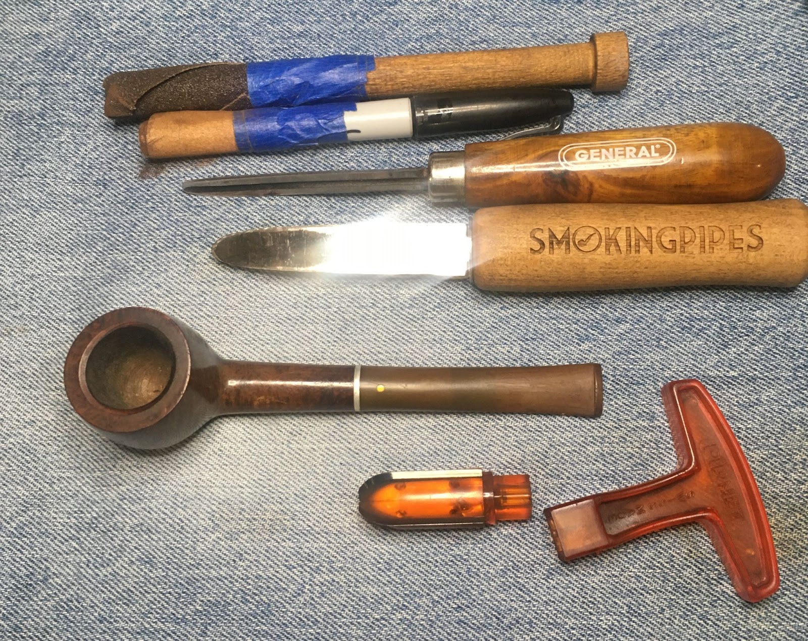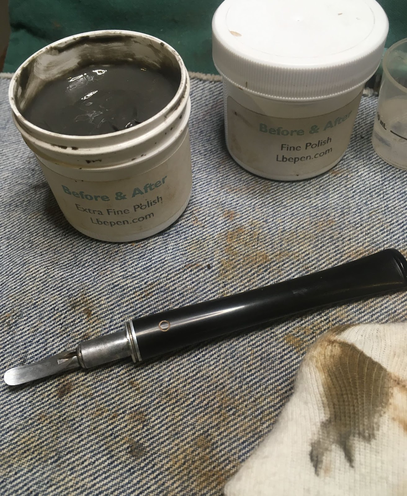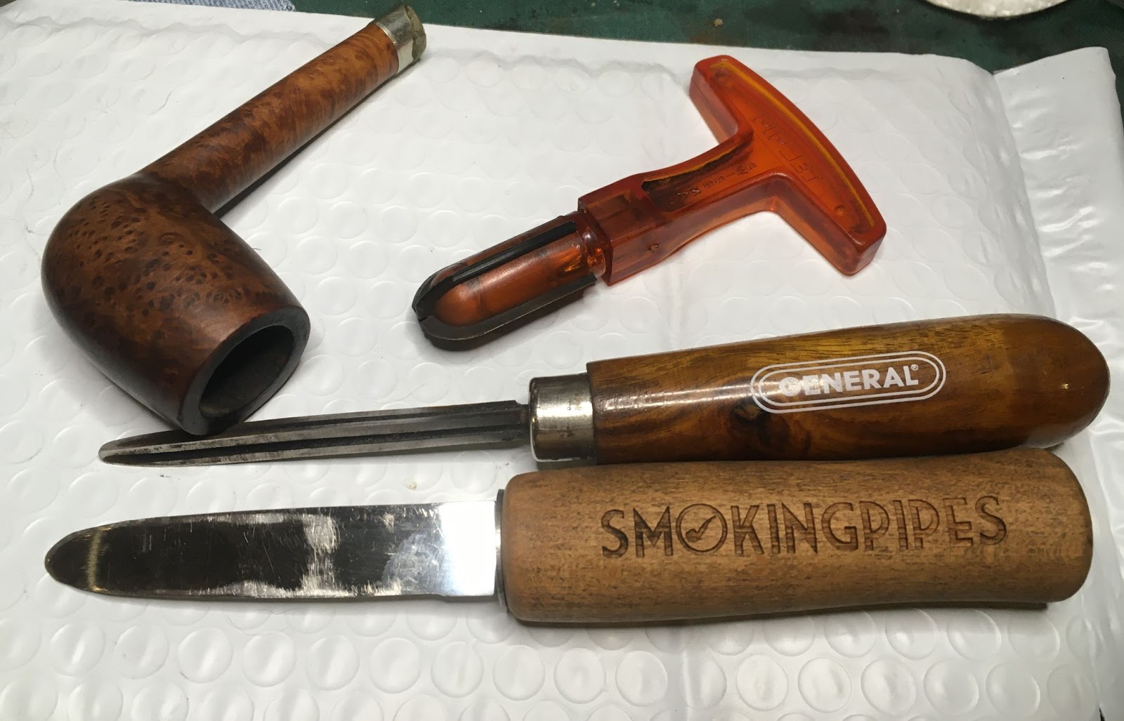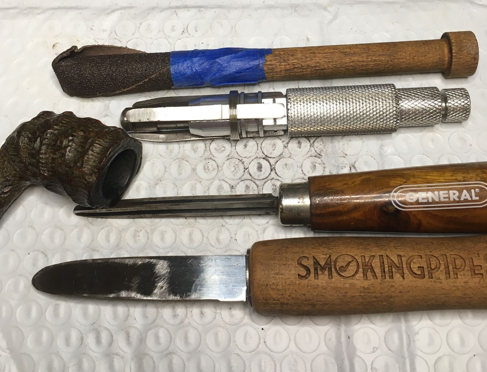 The first step was to ream the tobacco chamber. I used the PiNet reaming toot with the #2 blade, the Smokingpipes Low Country knife and the General triangular scraper for the brunt of the work. THe chamber was then sanded with 220 sandpaper wrapped around a wood dowel and 320 sandpaper wrapped around a Sharpie marker.