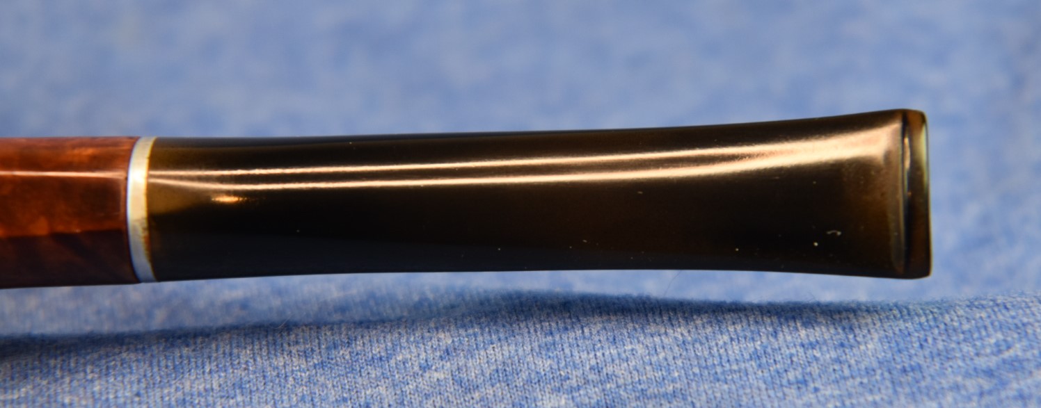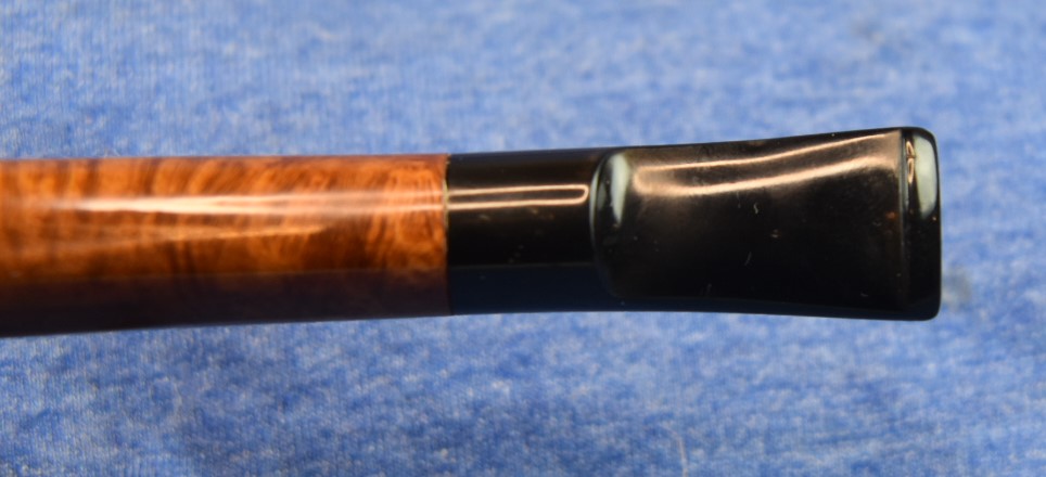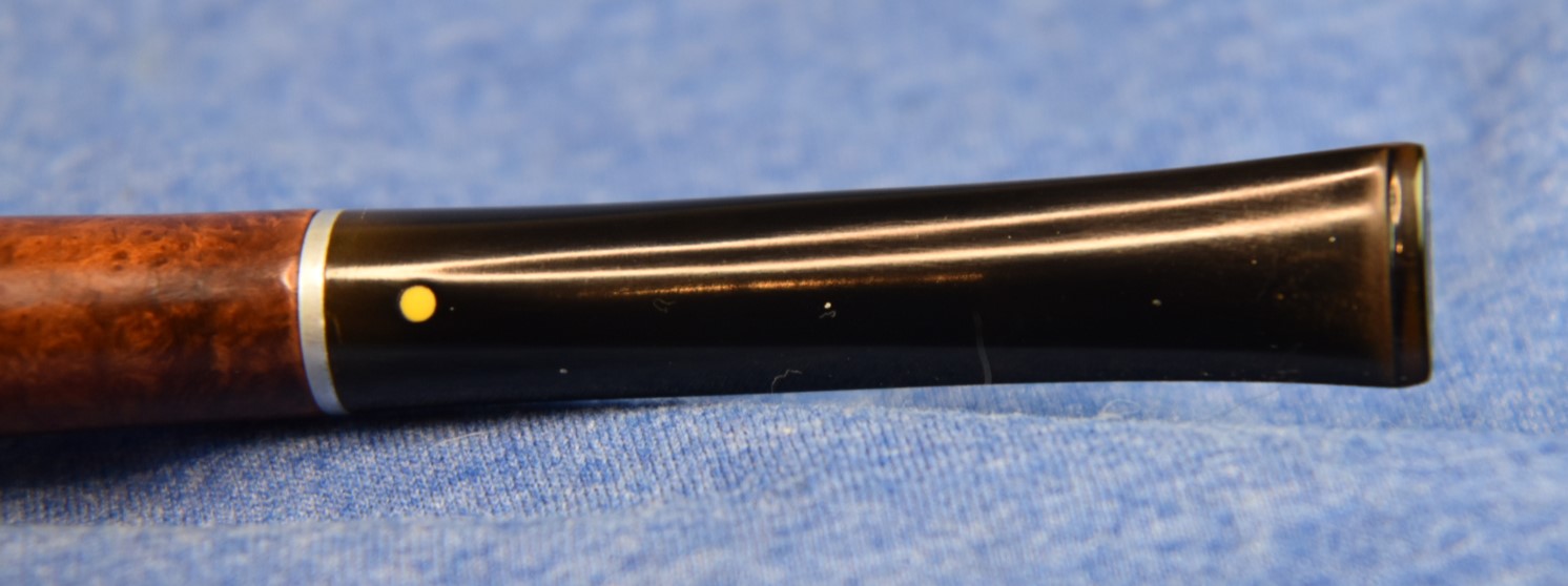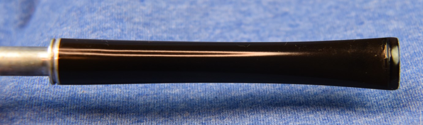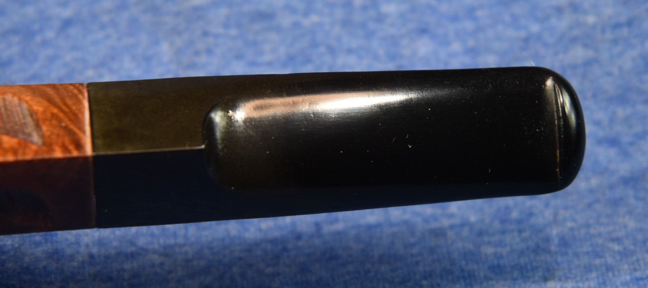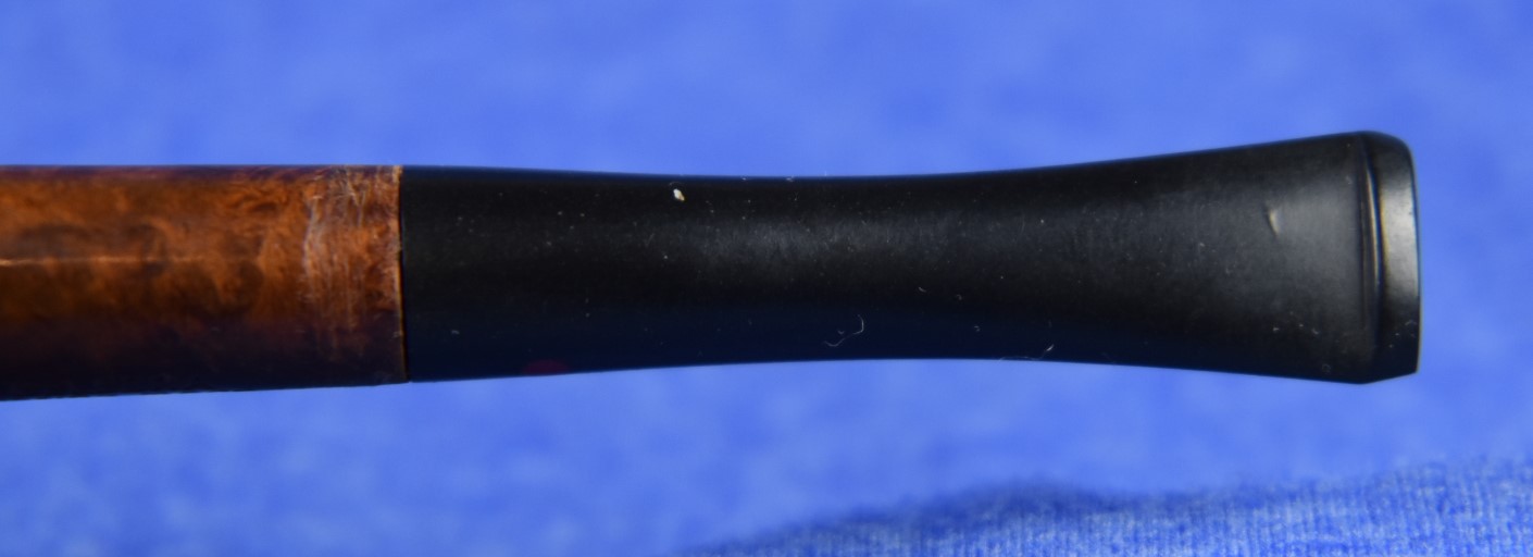 Next was the sanding of the stem. I reinserted it into the stummel as I did not want to round the junction of the stem/stummel by sanding them apart. I did not want to sand the rustication of the shank. Fortunately there was a narrow band of smooth briar next to the stem. With care I could sand and micro-mesh the smooth portion of the shank and the stem simultaneously. I started with the 600 sanding sponge and advanced through the 3500 sponge. Between each sponge I applied a drop of mineral oil rubbed in with my fingers and wiped away with a paper towel. Once finished with the sponges I moved on to the micro-mesh pads, 4000-12000. Again After each pad I applied a small drop of Obsidian Oil, working it in with my finger and wiped the stem with a paper towel.