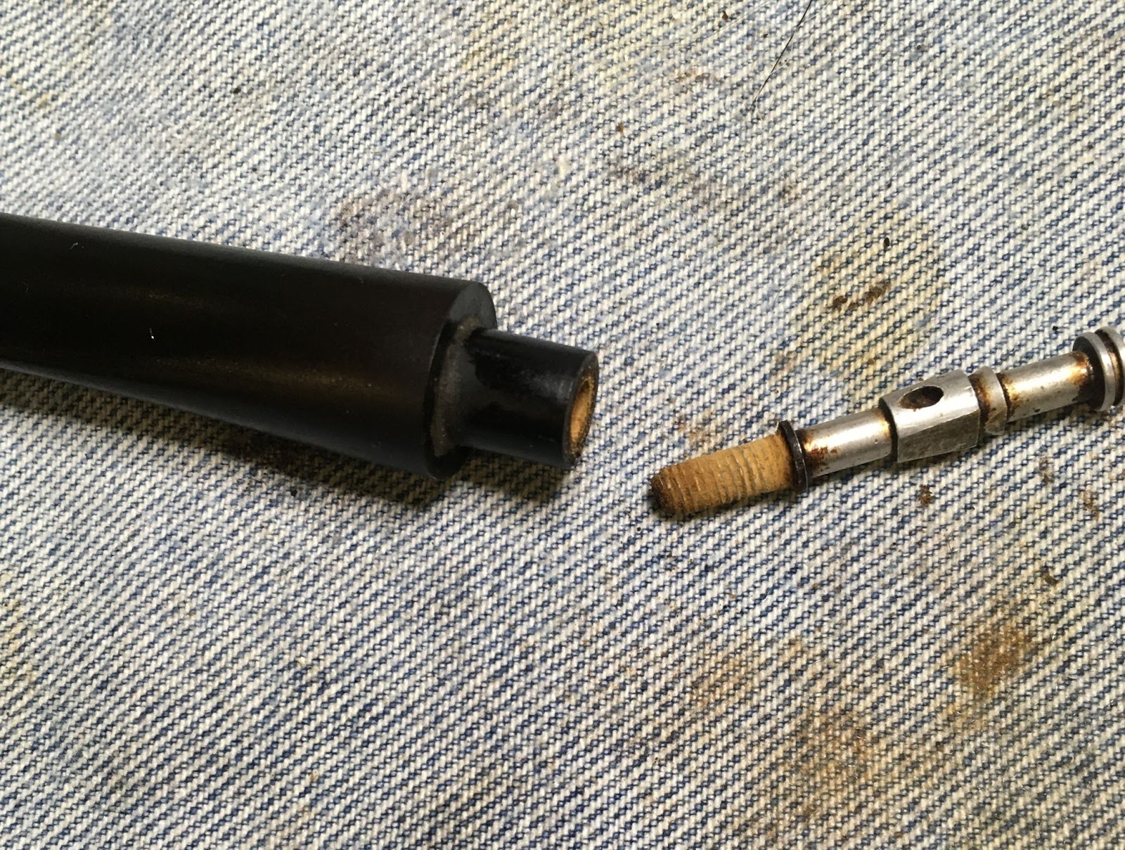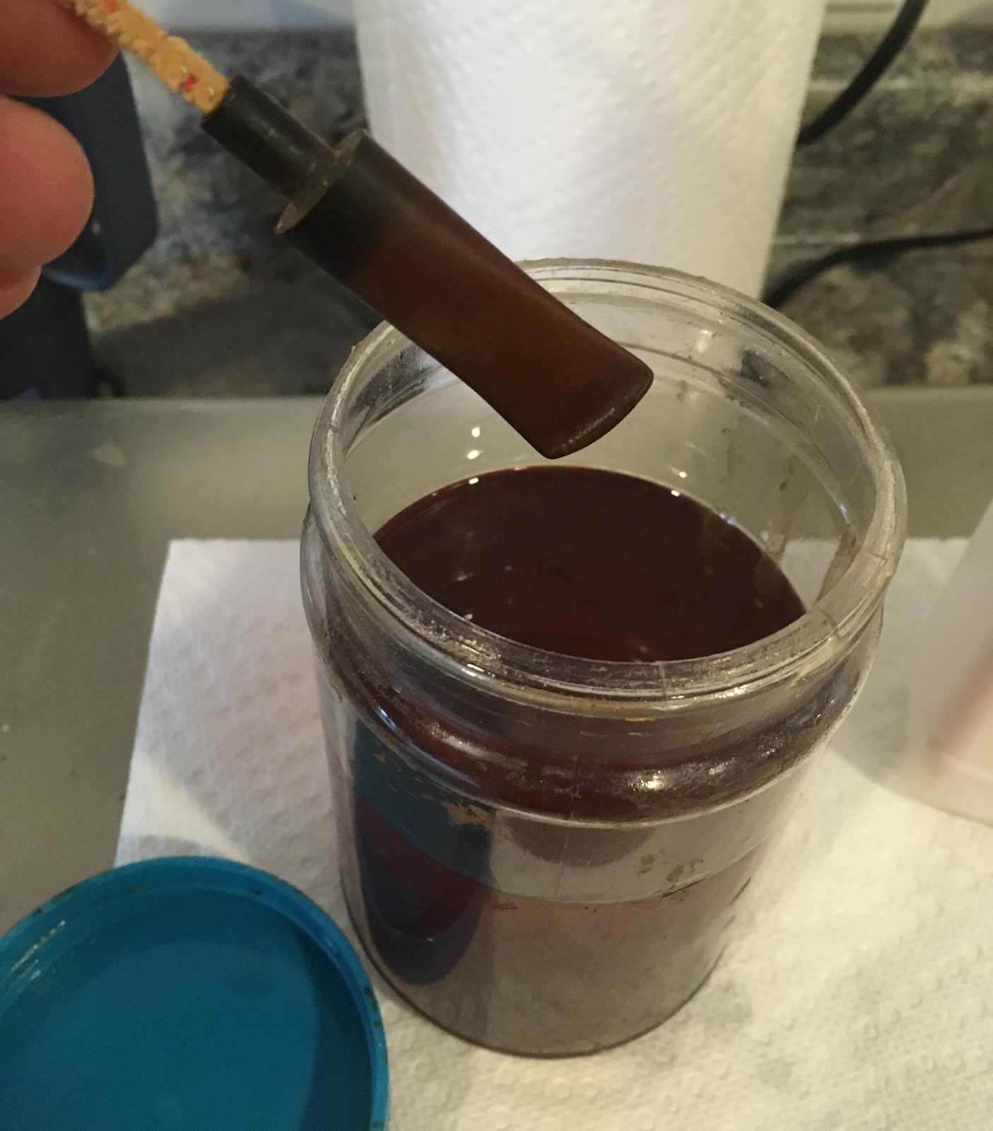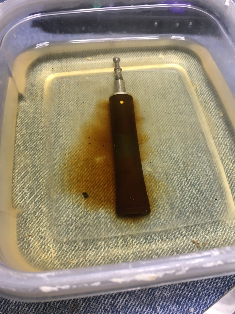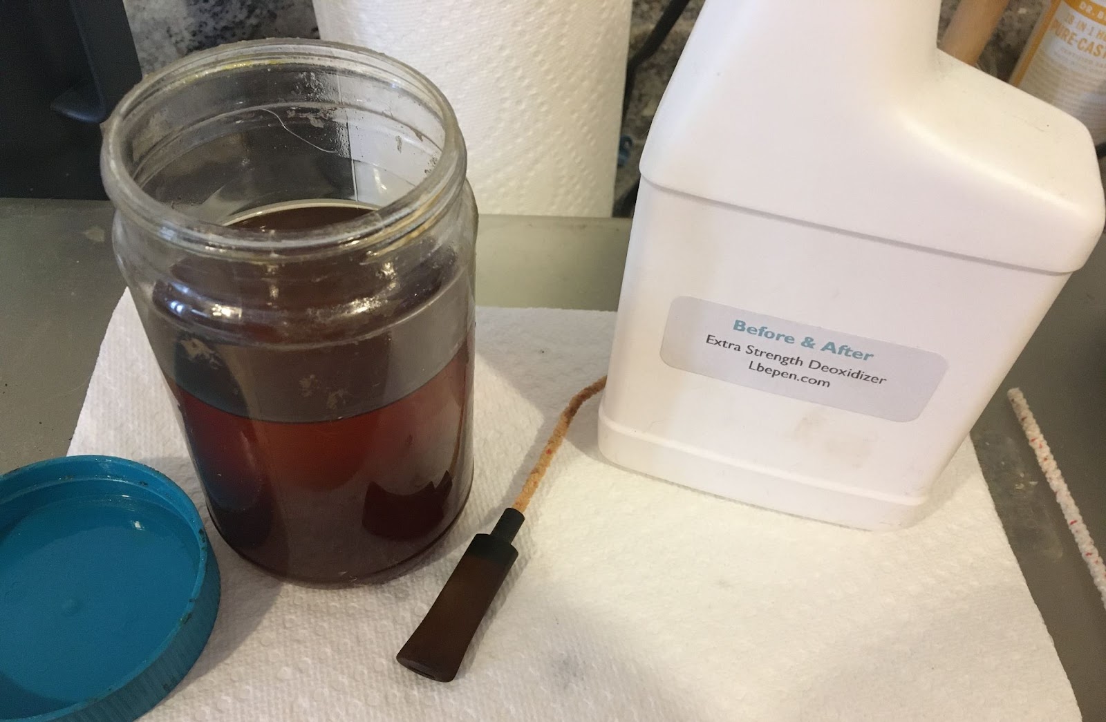 After the break I removed the stem from the deox jar. The excess solution was allowed to drip back into the jar. I used a coarse cotton shop rag to vigorously rub the solution from the stem until it was dry. The surface looked much better but still there remained a brown