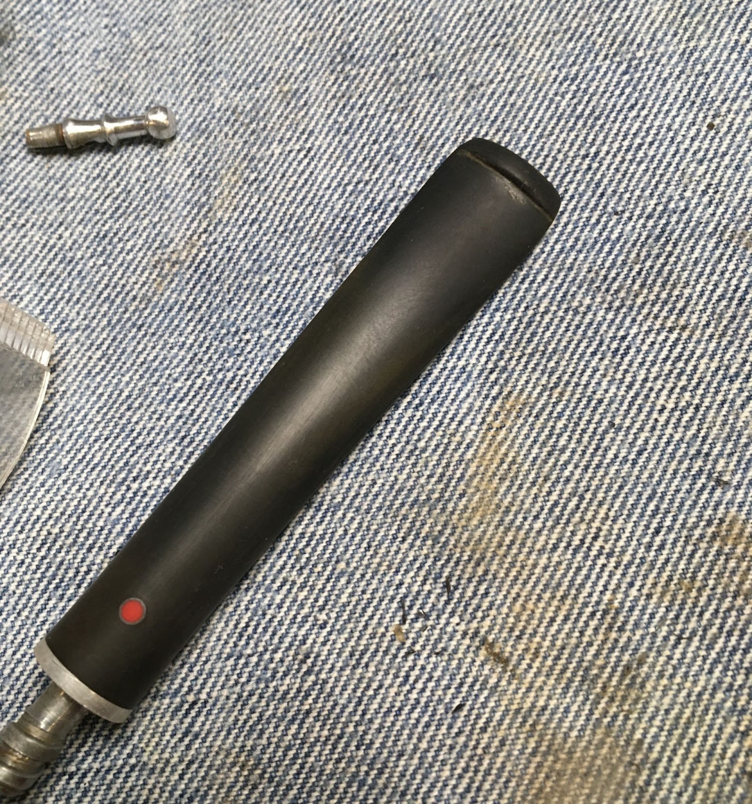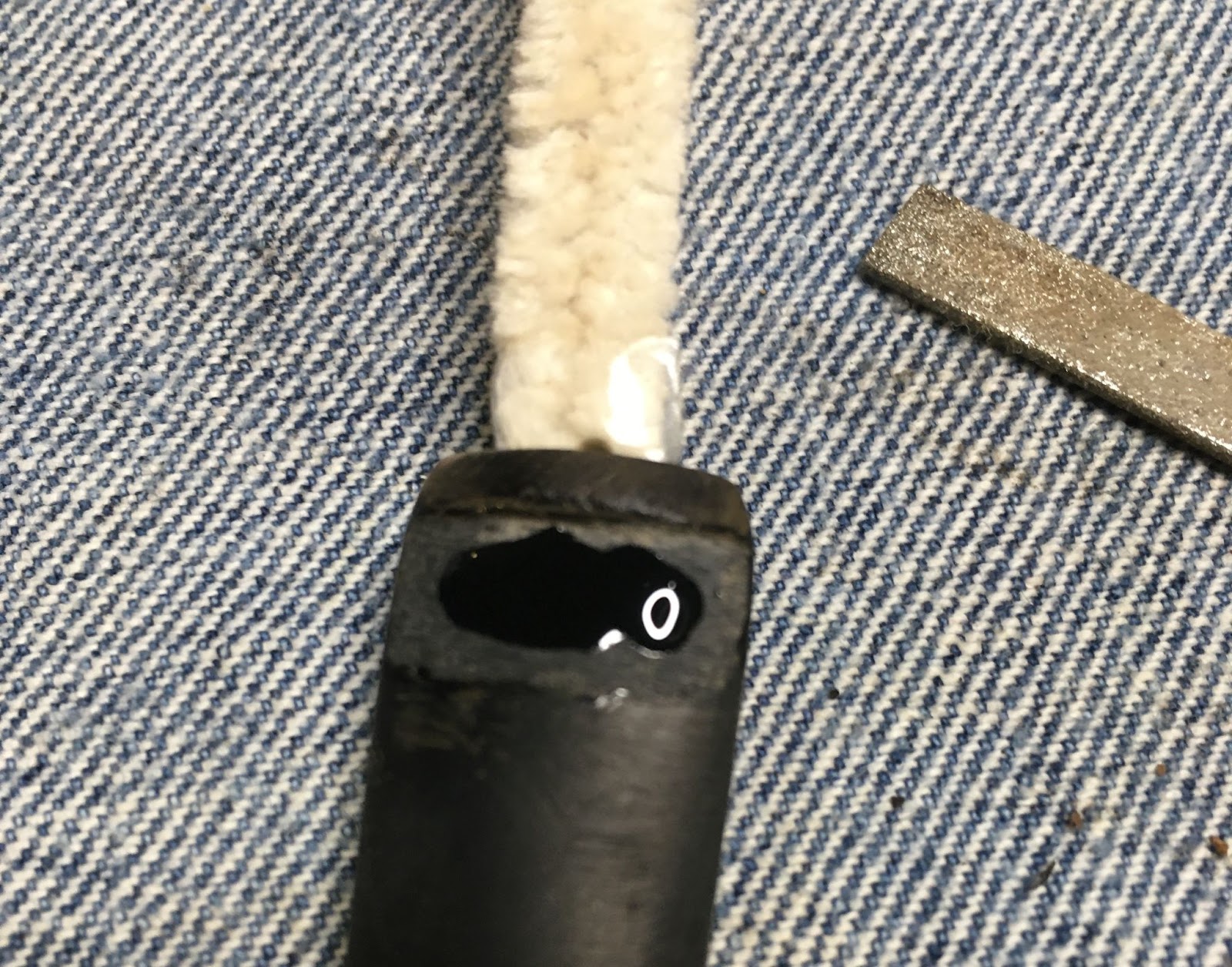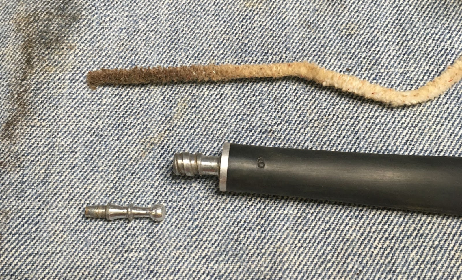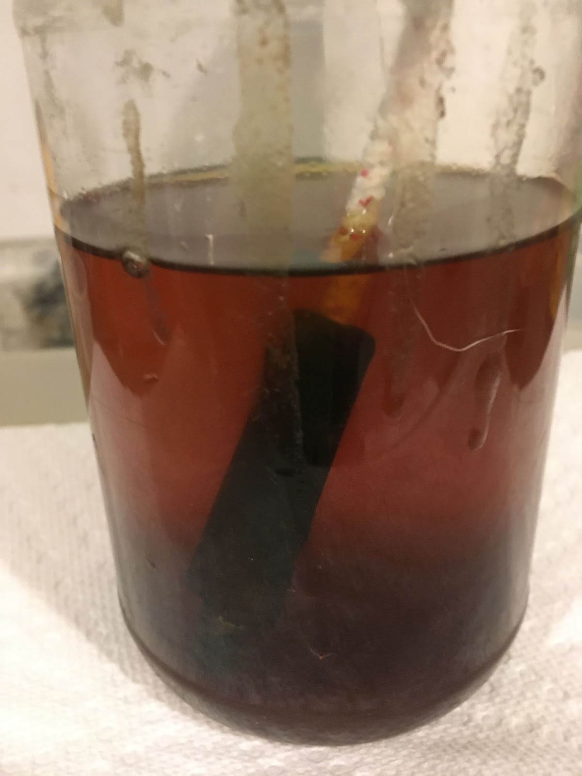 After the break I removed the stem from the deox jar. The excess solution was allowed to drip back into the jar. I used a coarse cotton shop rag to vigorously rub the solution from the stem until it was dry. The surface looked much better but still there remained a brown