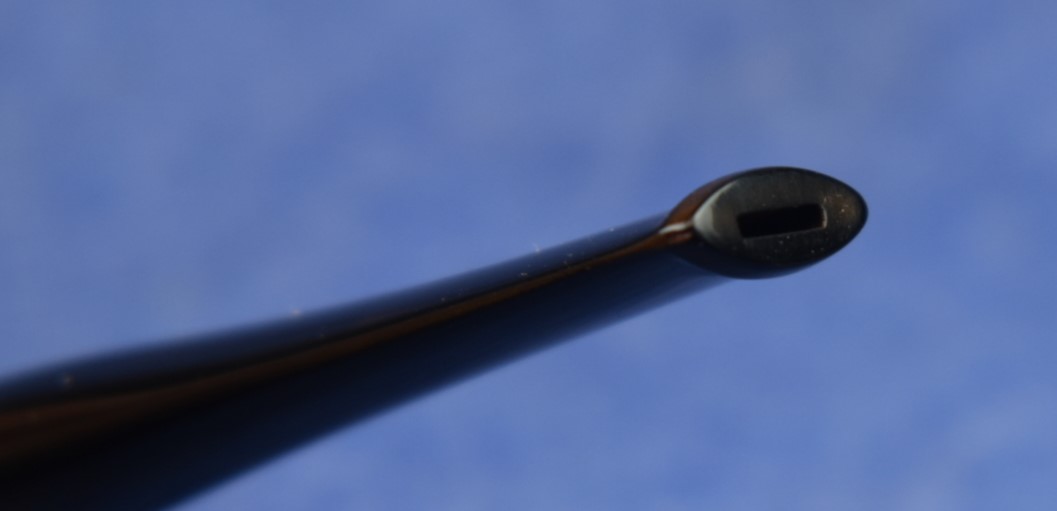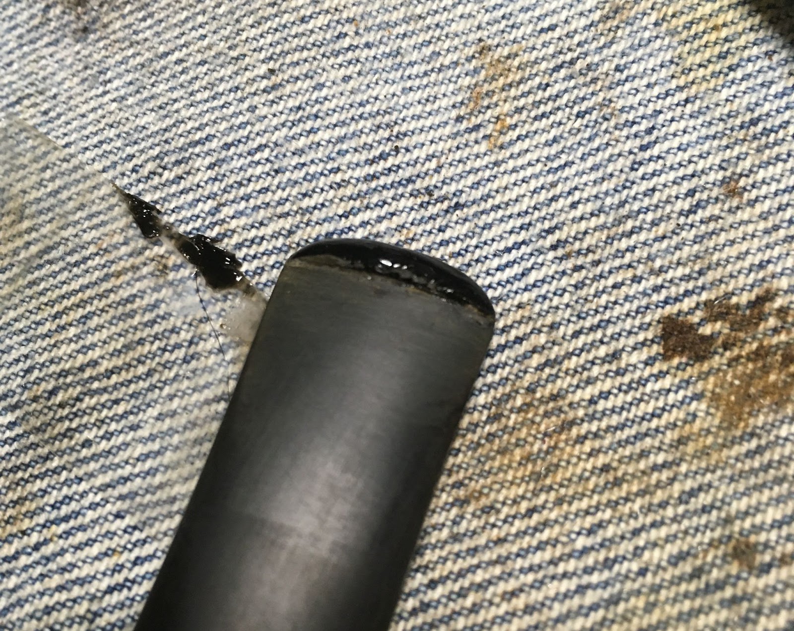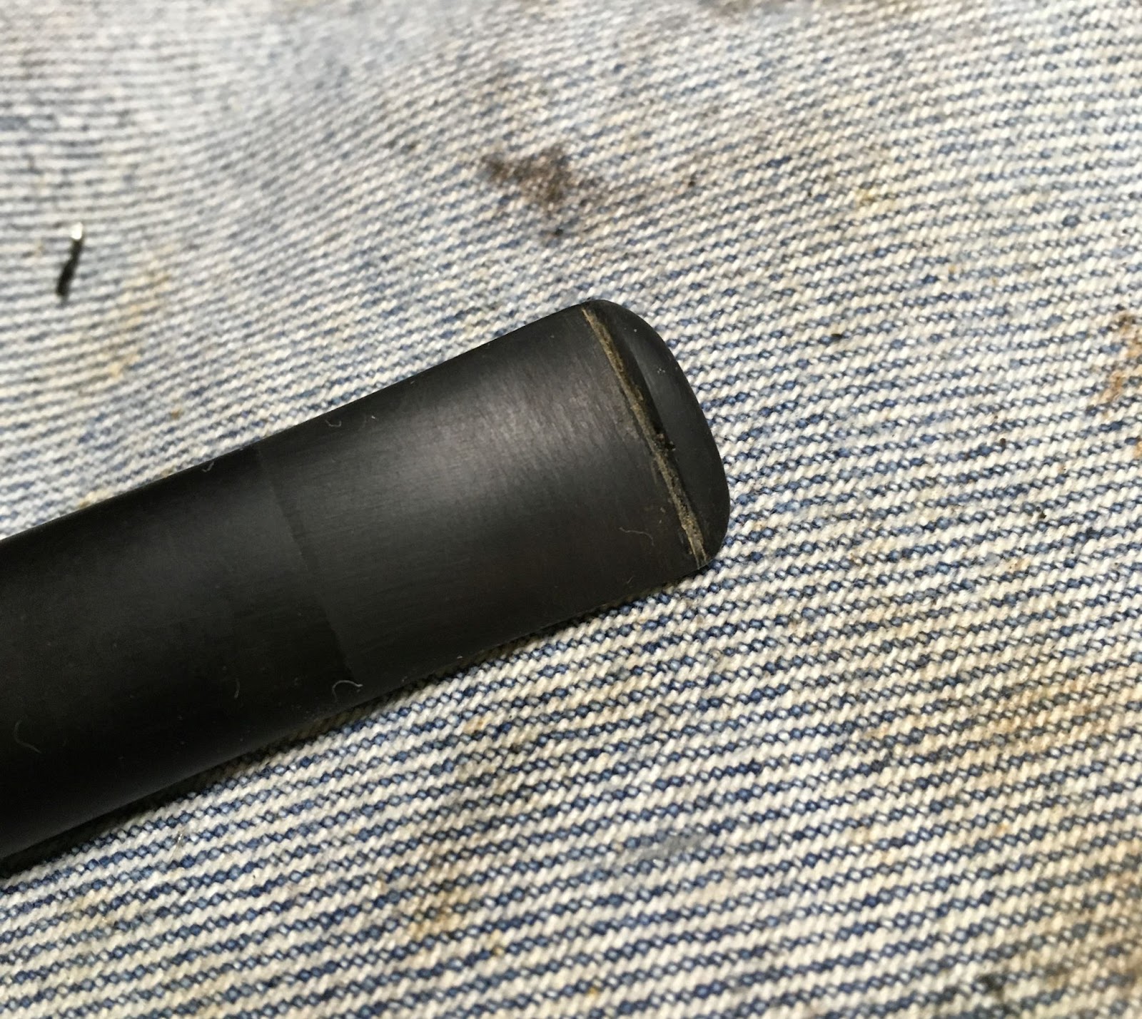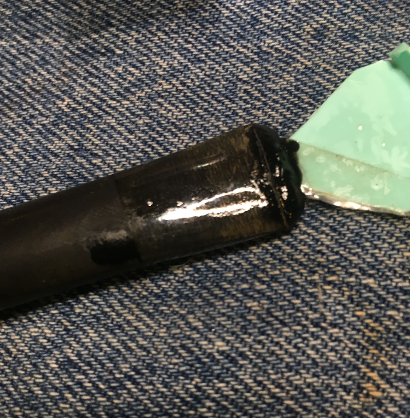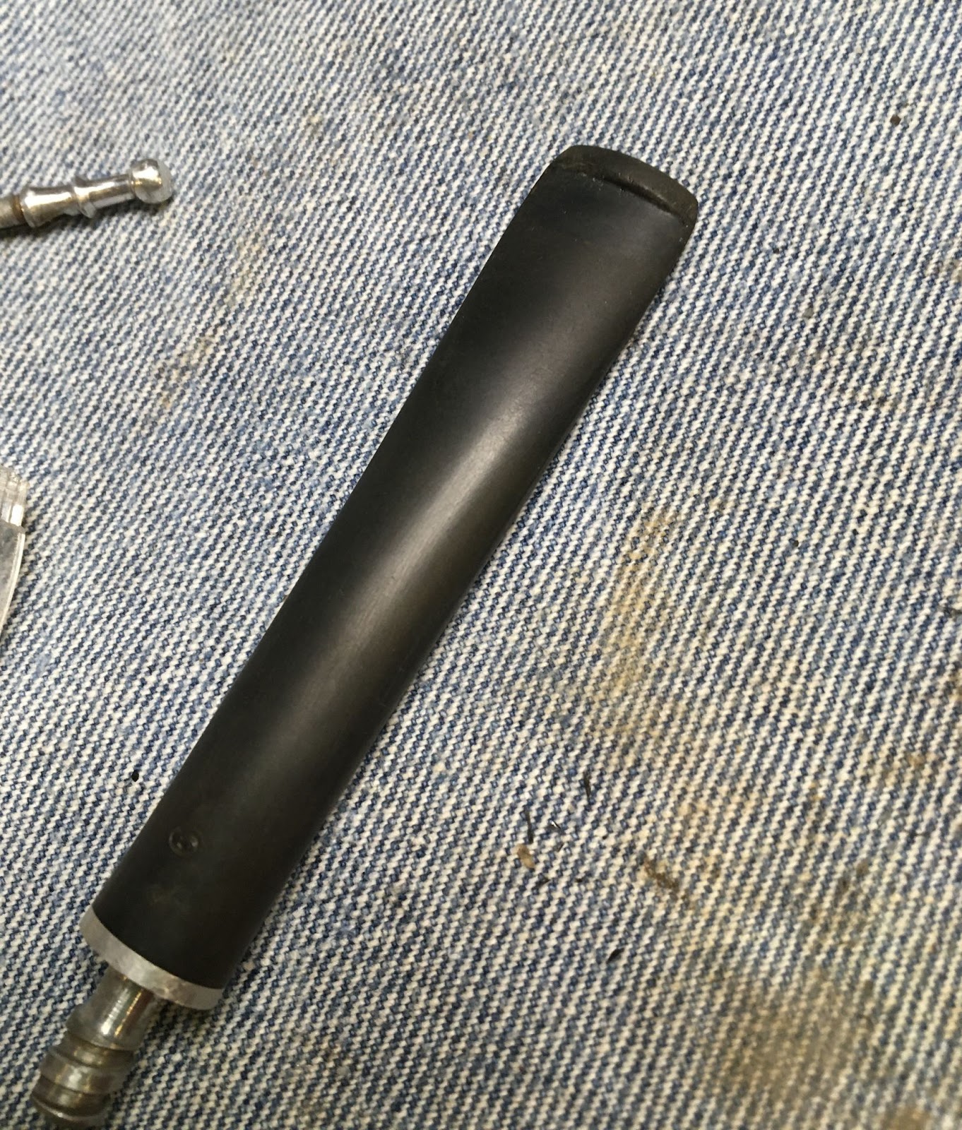 After the break I removed the stem from the deox jar. The excess solution was allowed to drip back into the jar. I used a coarse cotton shop rag to vigorously rub the solution from the stem until it was dry. The surface looked much better but still there remained a brown