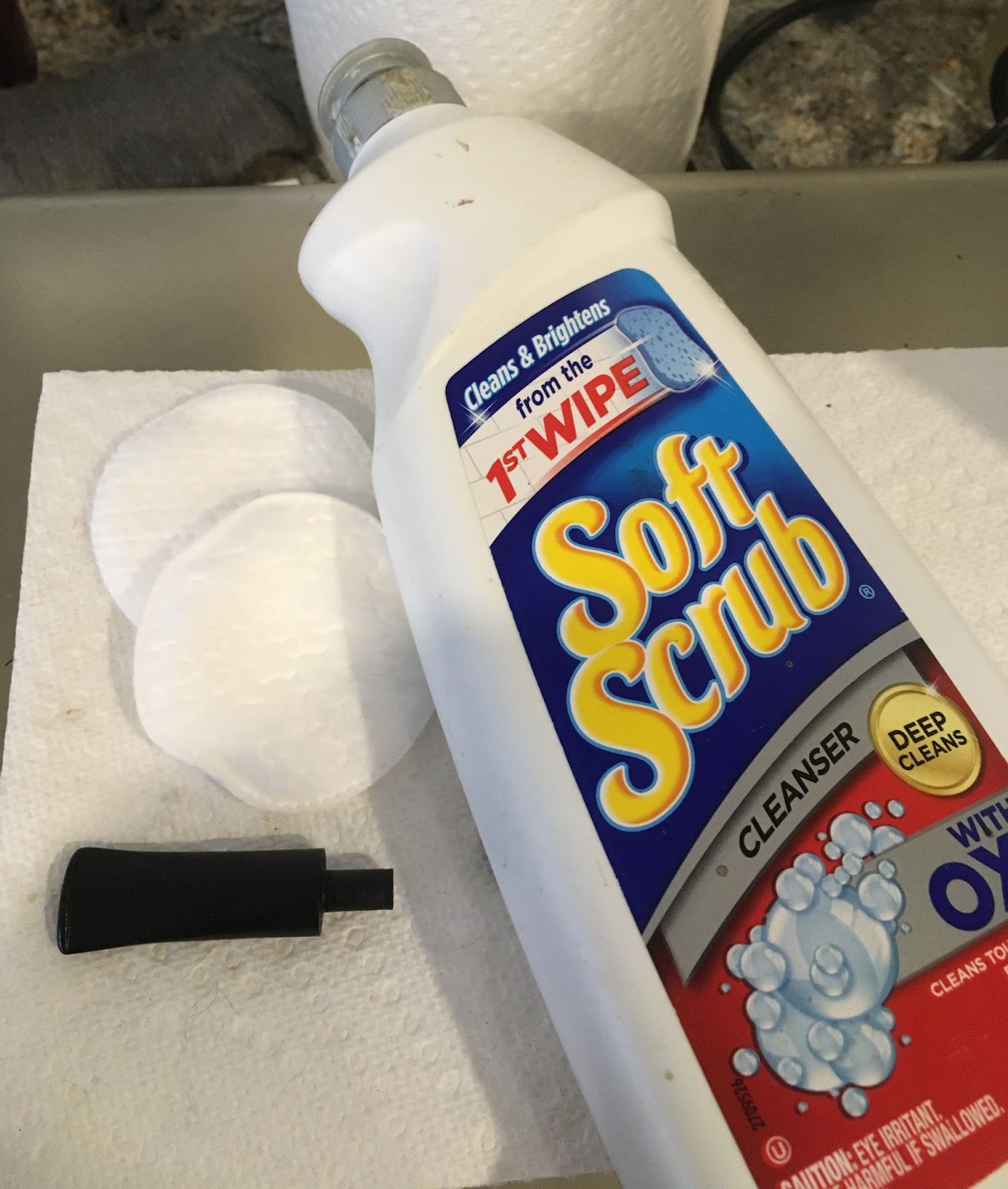 tinge to the stem. I ran a couple of pipe cleaners through the stem to clean it of the solution and started working on it with make-up pads with a dab of Soft Scrub. This quickly made the pad dark with oxidized rubber. After a few pads with Soft Scrub applications the stem was looking very nice. I cleaned out the inside with bristle pipe cleaners dipped in 99% isopropyl alcohol until they too returned clean.