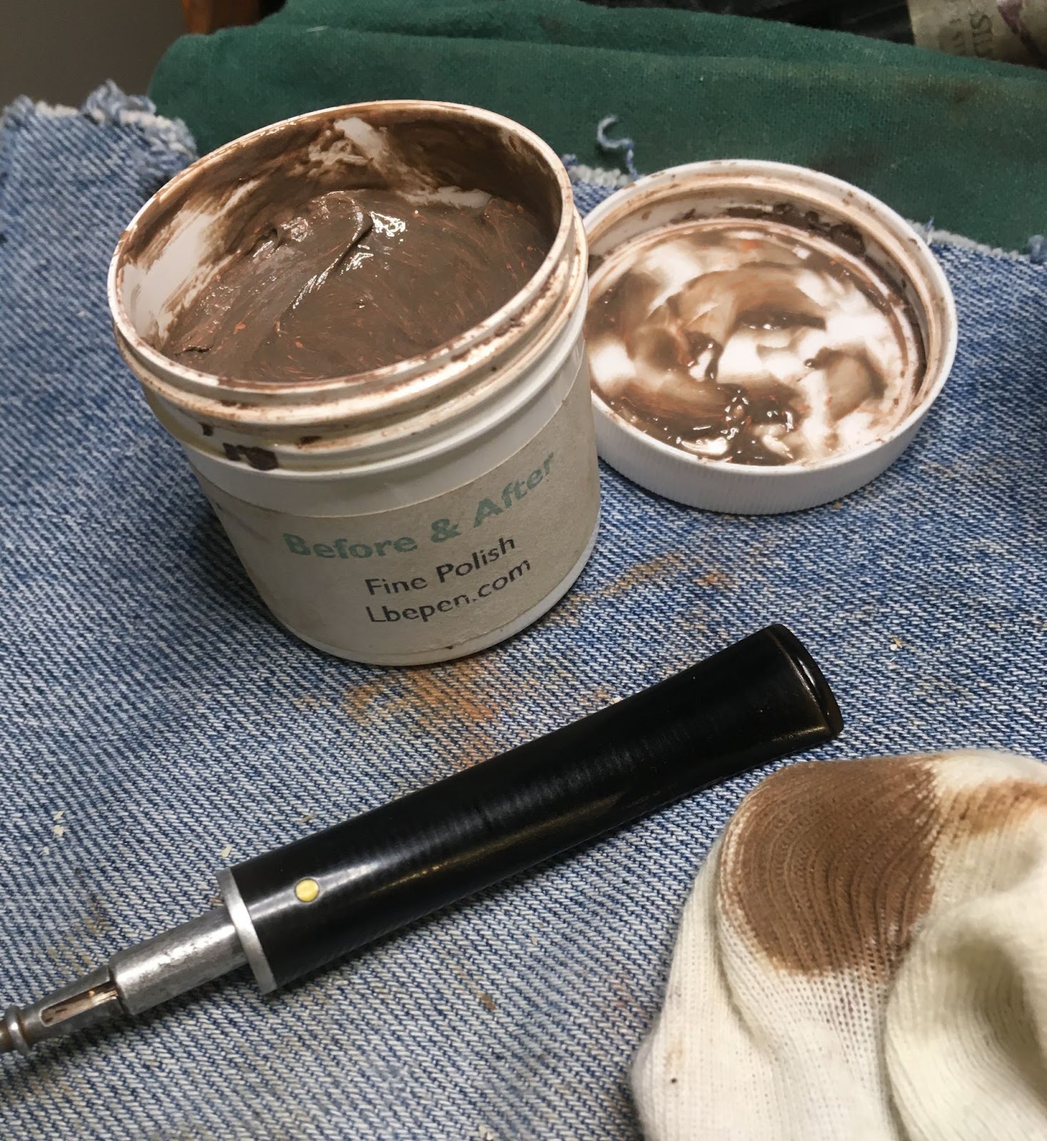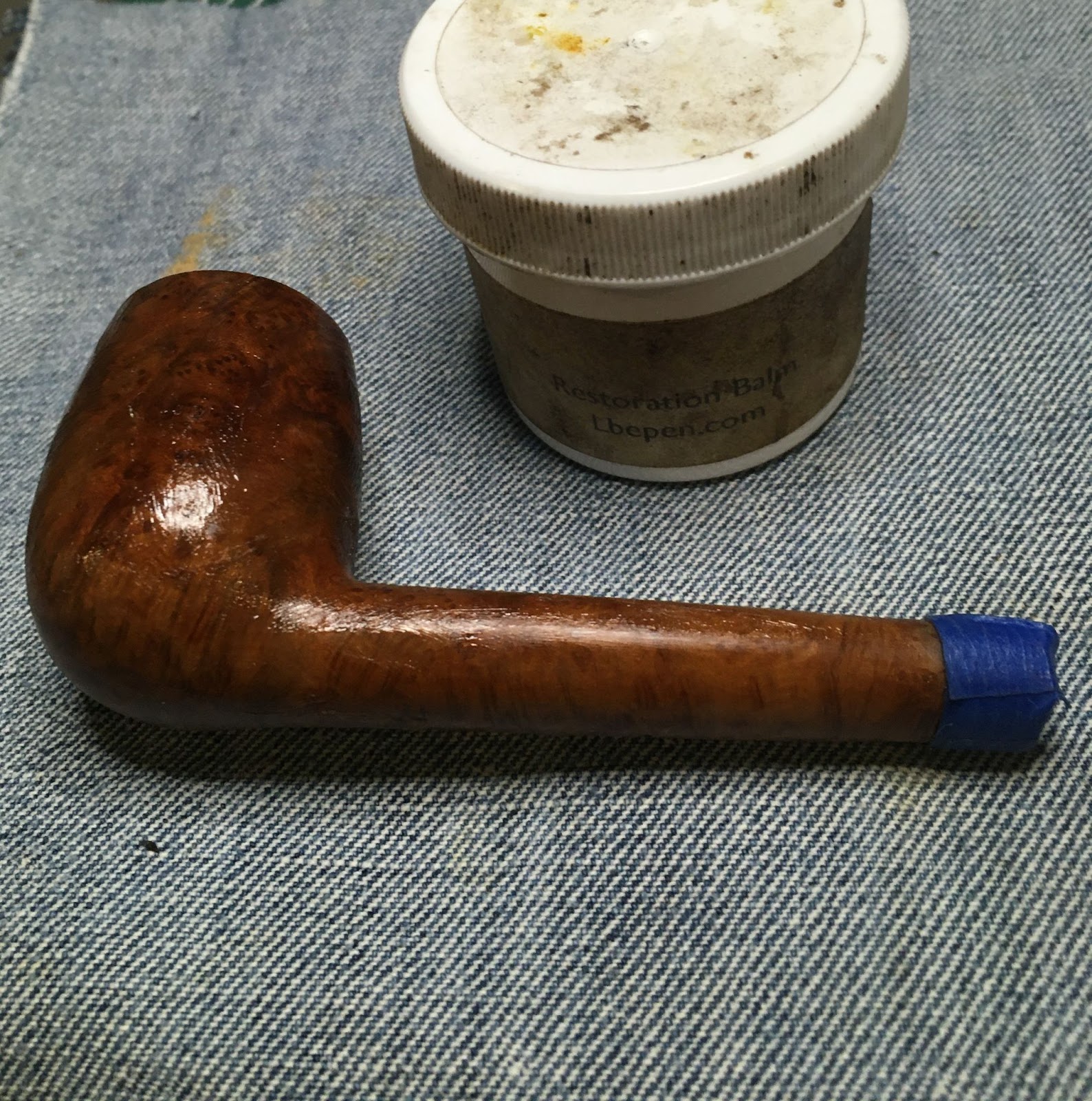 The stummel did not receive any sanding nor micro-meshing. I applied a coating of Before and After Restoration Balm and allowed the pipe to sit overnight. In the morning the Restoration Balm had dried significantly yet remained tacky. I put a brand new cotton buffing wheel on the buffer and used that to buff away the excess balm. The pipe was looking very nice and like I assume it did when new. I did want to apply wax to it though. I chose to use the Decatur Pipe Shield No-Buff Wax. This was applied with my finger