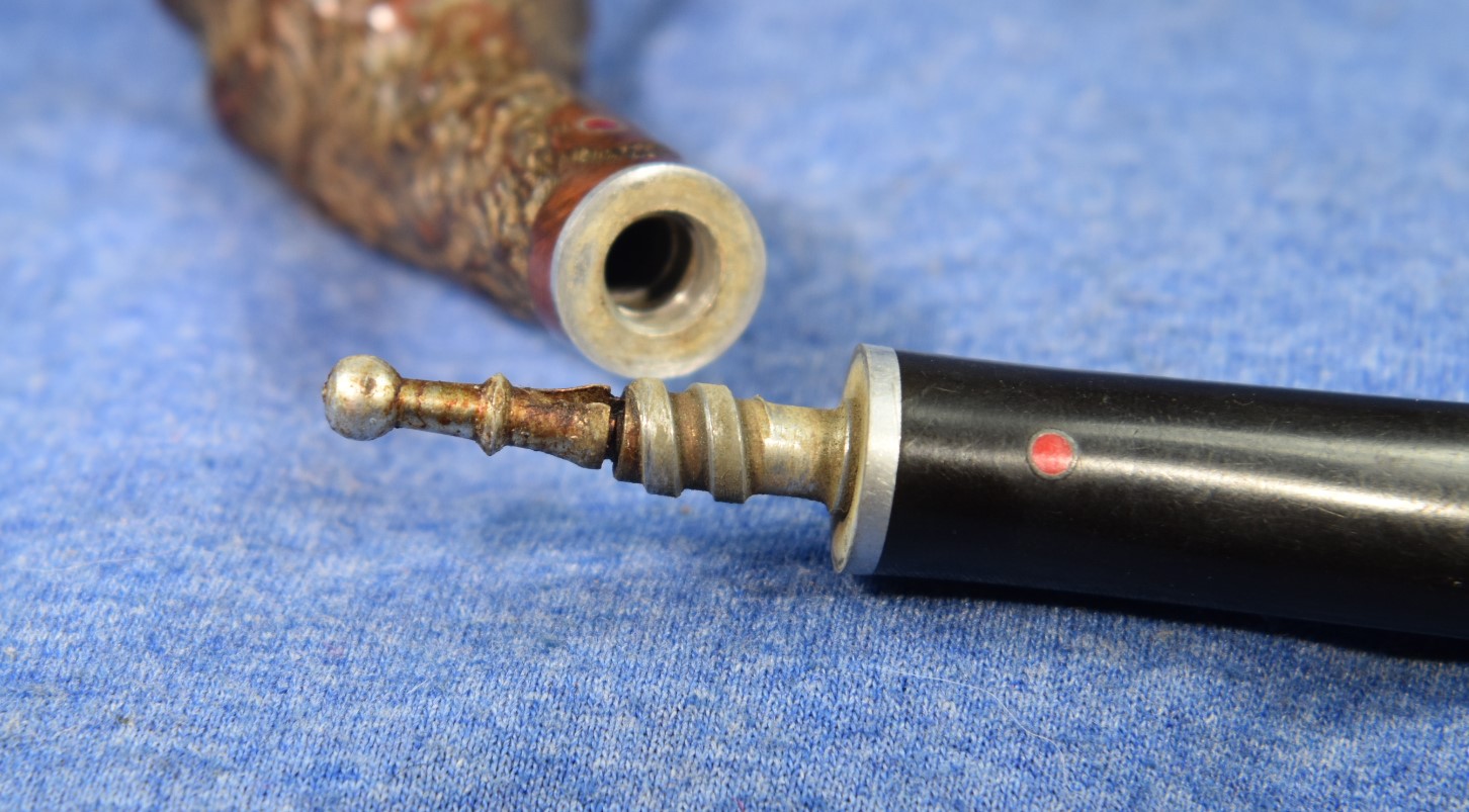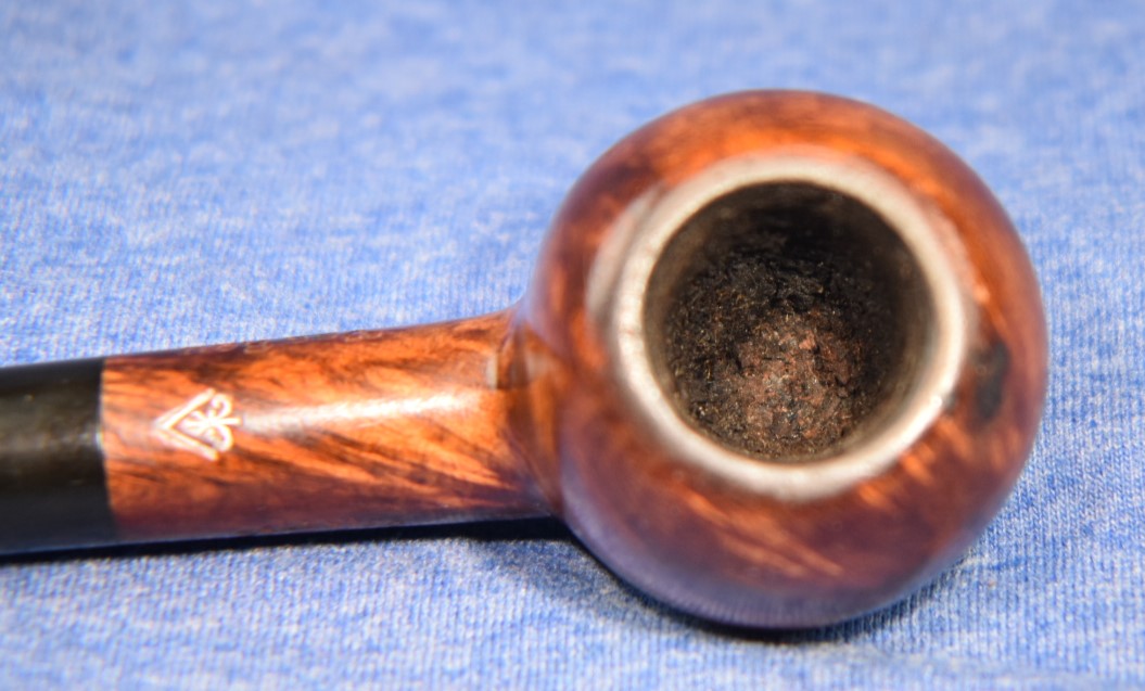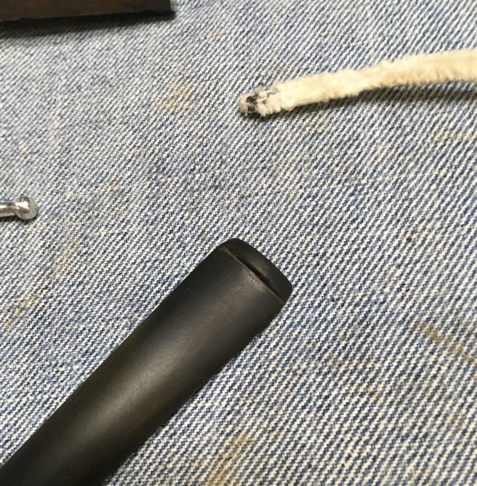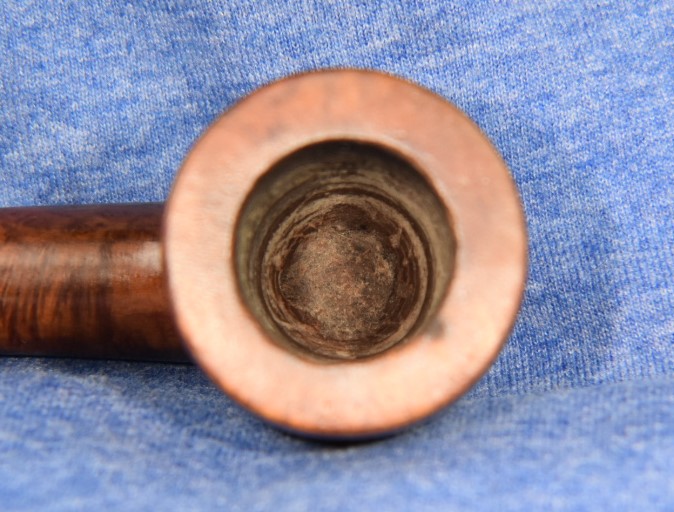 On to the restoration. The pipe received a new piece of denim for the work surface and was disassembled. The rim showed lava accumulation and maybe a bit of charring. This required cleaning to assess the condition of the rim. The stummel was shiny but I wasn’t sure if it was due to a clear coat of some kind or an accumulation of wax. Either way cleaning of the stummel would reveal that. The stem was in need of sanding and oxidation removal with potentially a slight reshaping of the button.