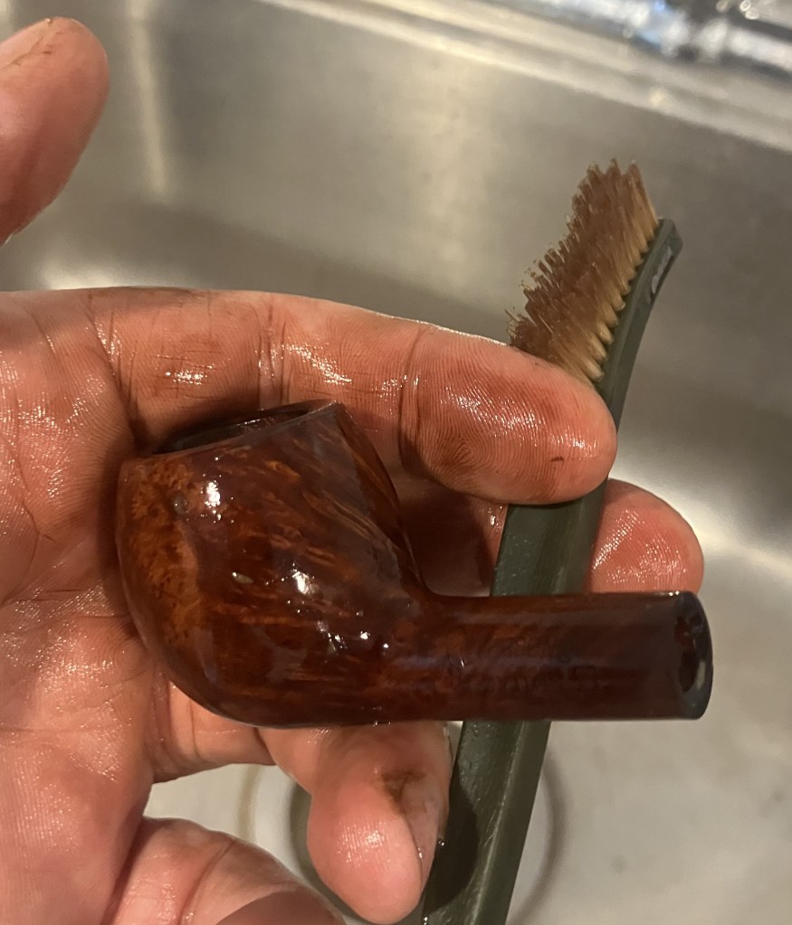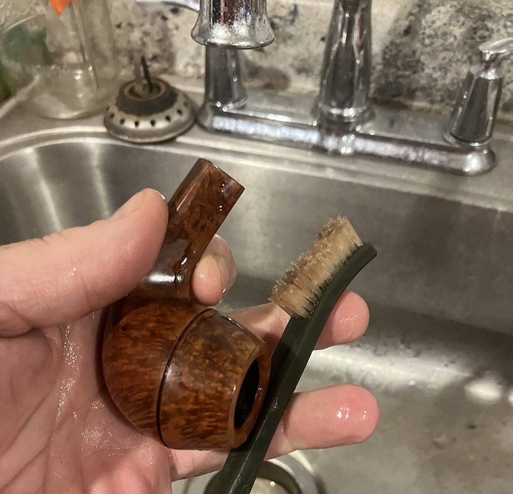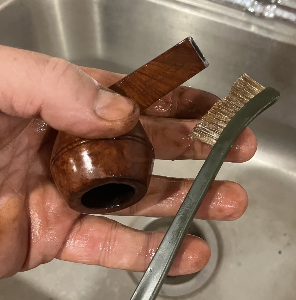 Next, the pipe was taken to the sink for a scrub with warm water and a nylon brush.