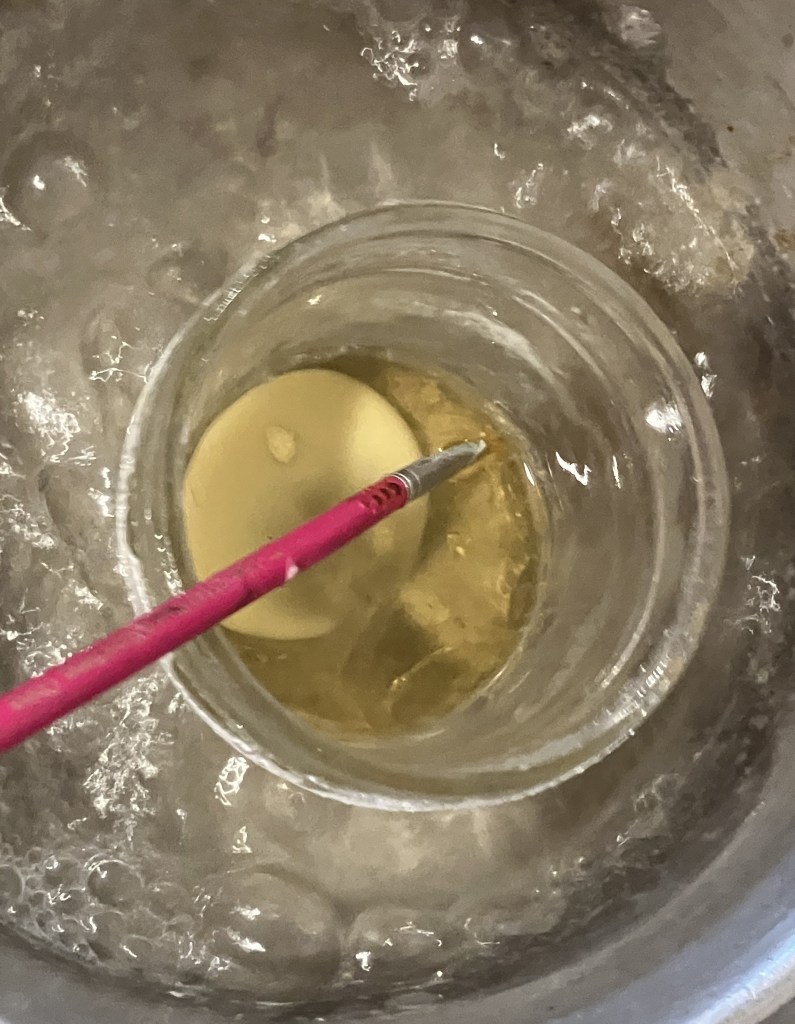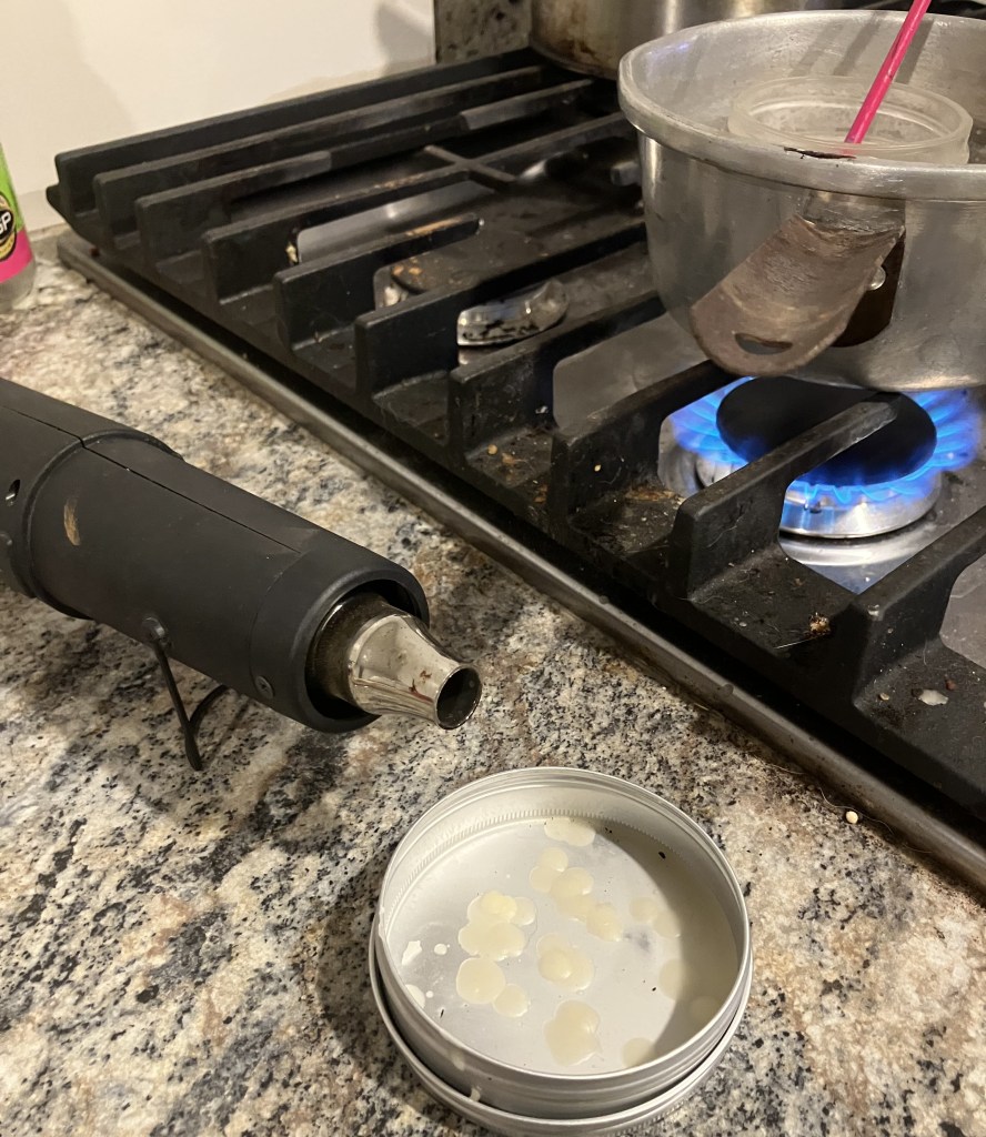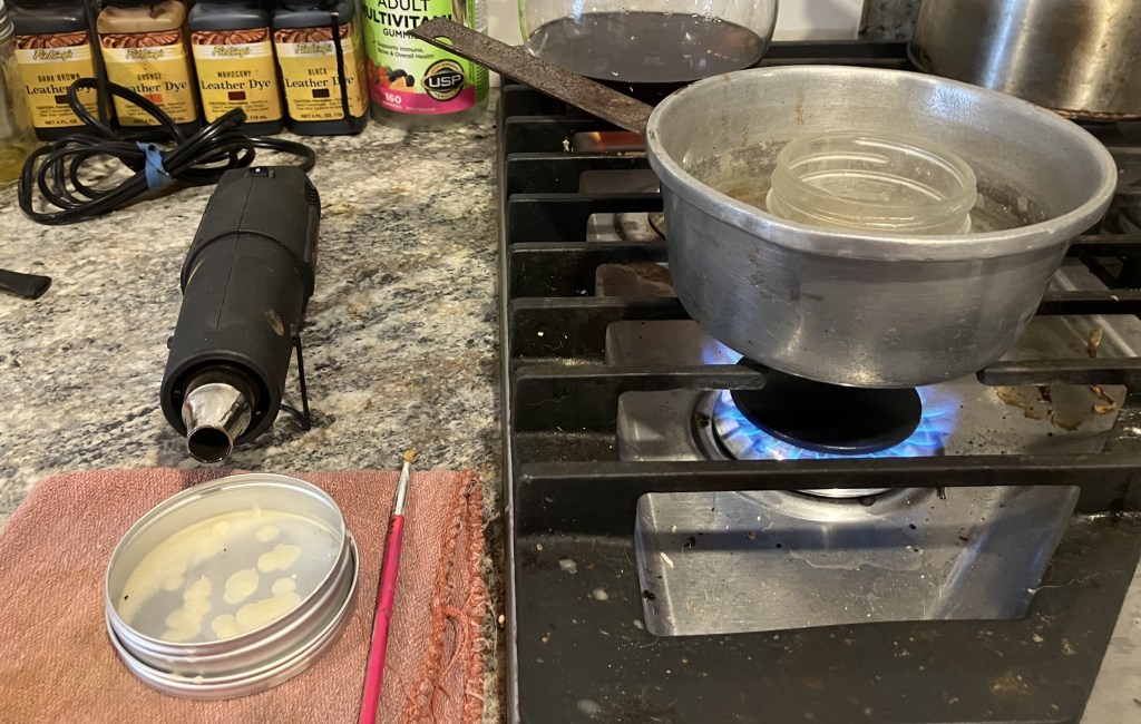 I use a hot water bath to melt the beeswax. A small jelly jar with the beeswax is set in boiling water. The water, once hot, melts the wax and will keep the beeswax liquid for longer amounts of time. The tin is used to catch dripping wax as I brush it onto the meerschaum while the heatgun provides heat to the stummel and to the wax as it is applied.