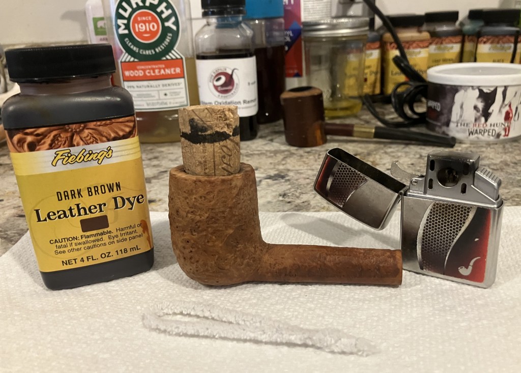 I pre-heated the stummel with the heat gun. A wine bottle cork was used to plug the tobacco chamber and as a handle.