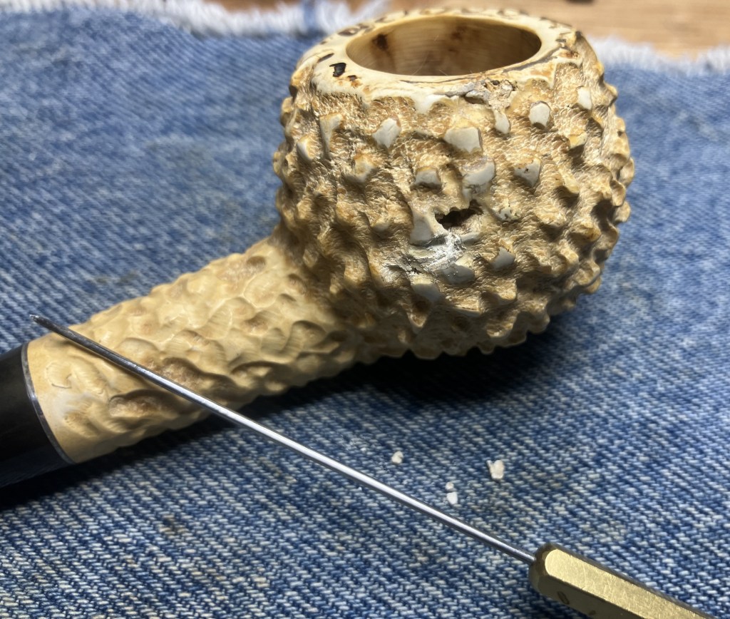I picked at the pit on the outside edge of the stummel to remove the loose material. I assumed this to be an attempt at filling the pit from the factory. The material was white and much softer than the surrounding meerschaum.
